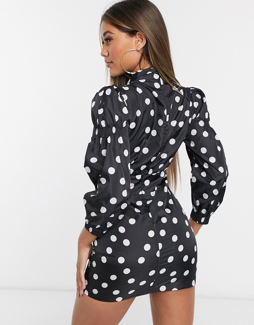 Lioness czarna sukienka w groszki z kopertowym przodem i bufkami 42