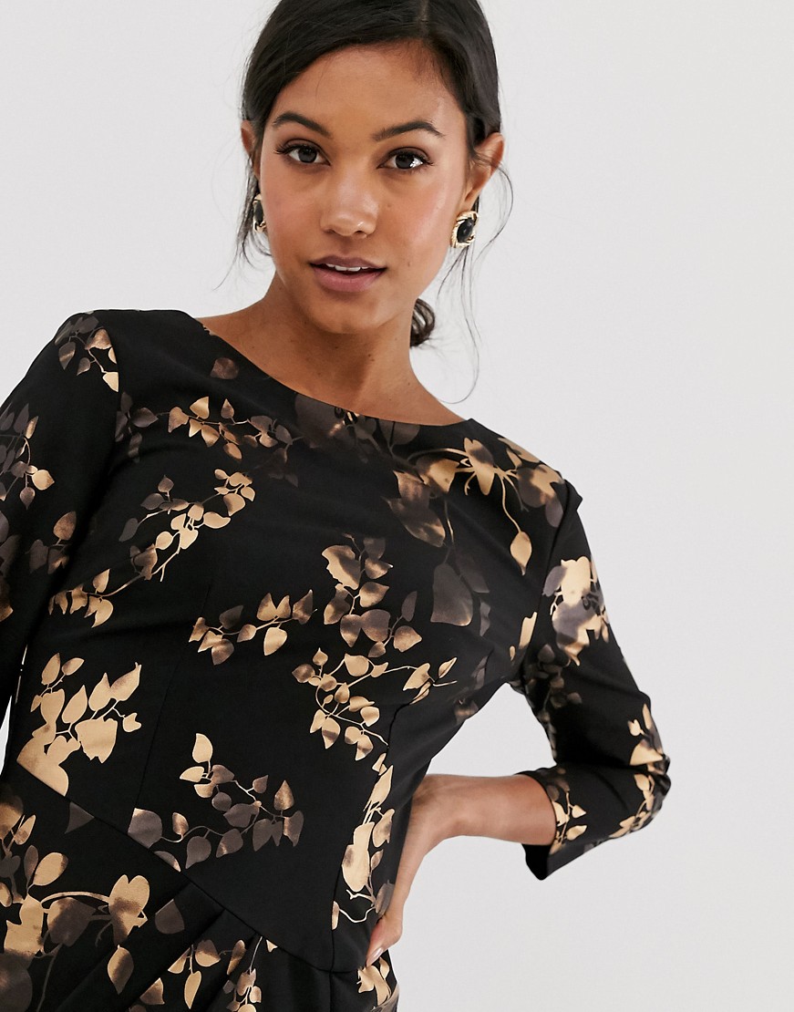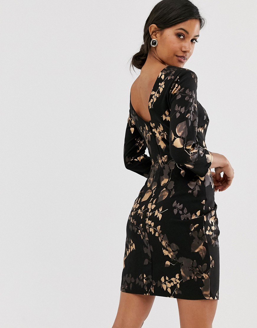 Little Mistress czarna dopasowana sukienka mini złote kwiaty 36