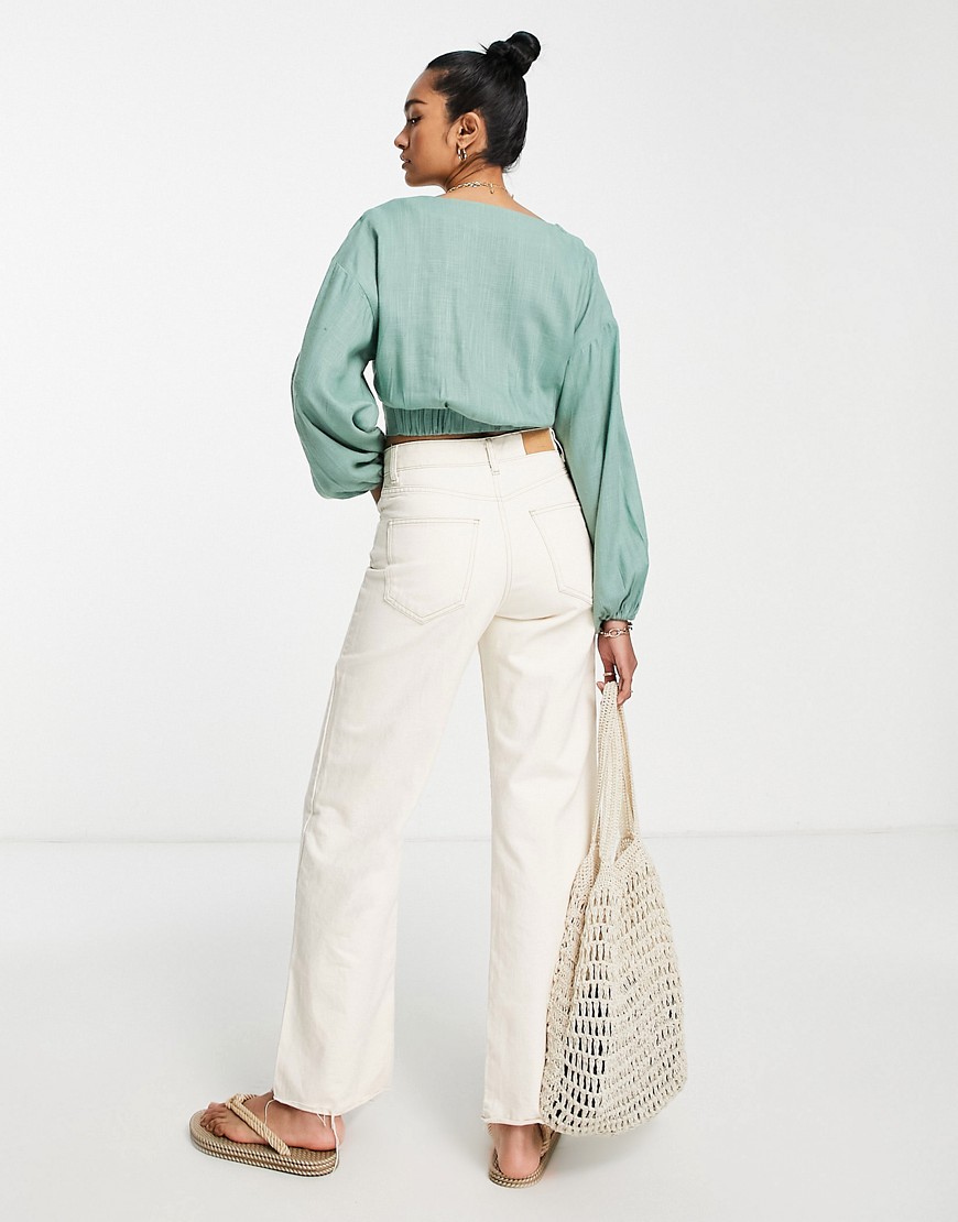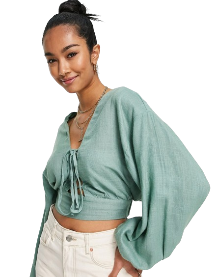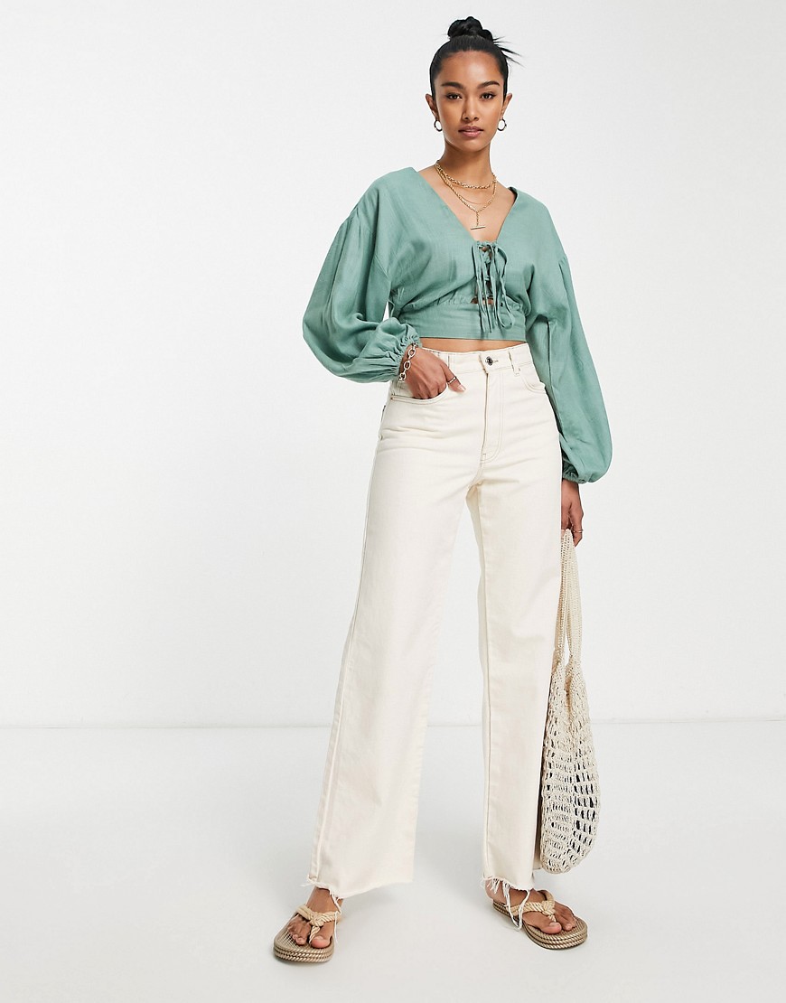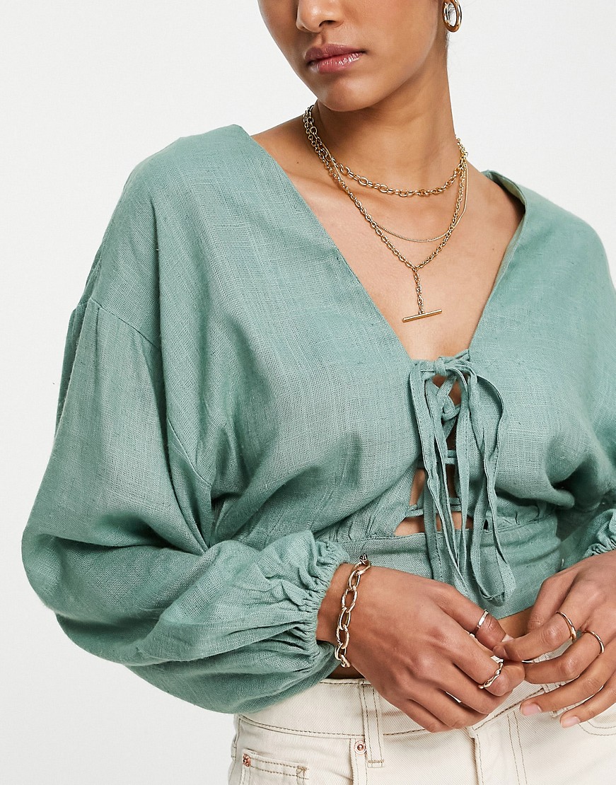 Lniany top w kolorze khaki ze sznurowanym przodem i obszernymi rękawami 40