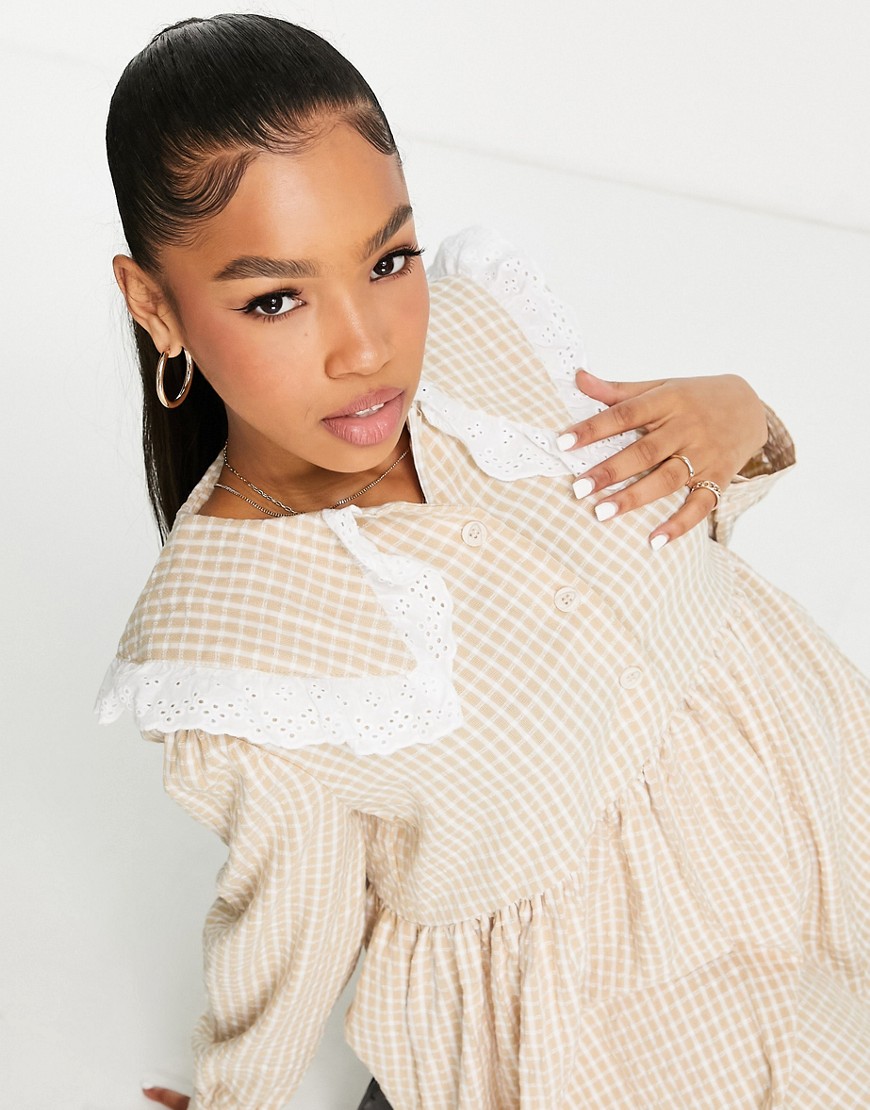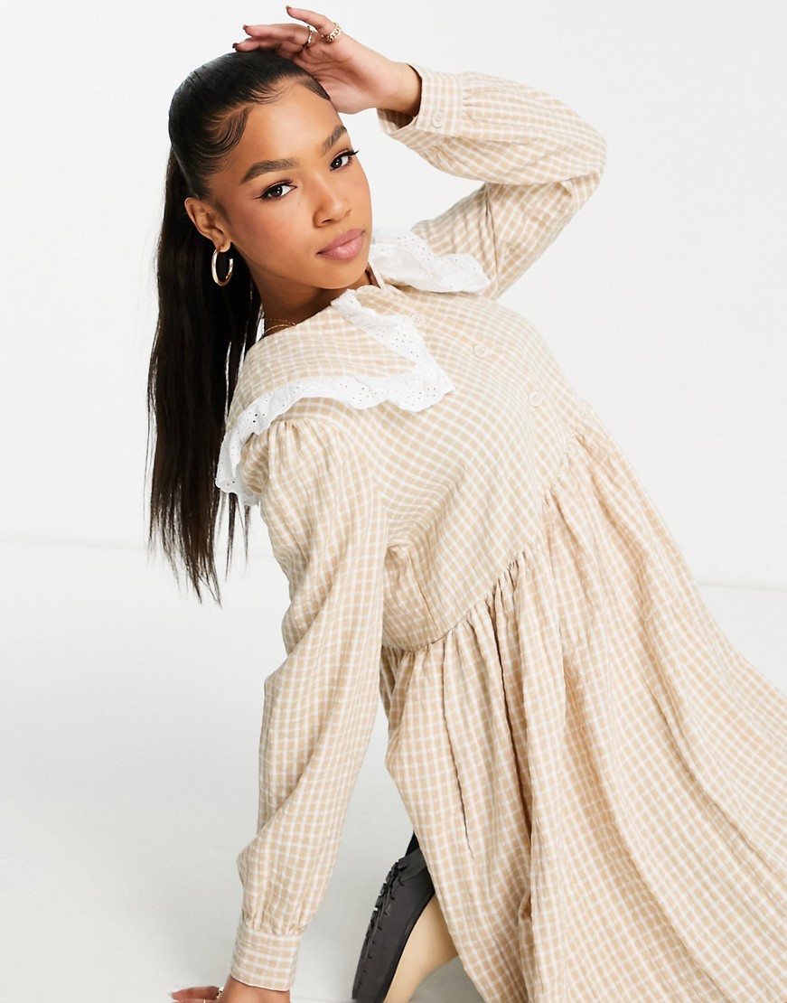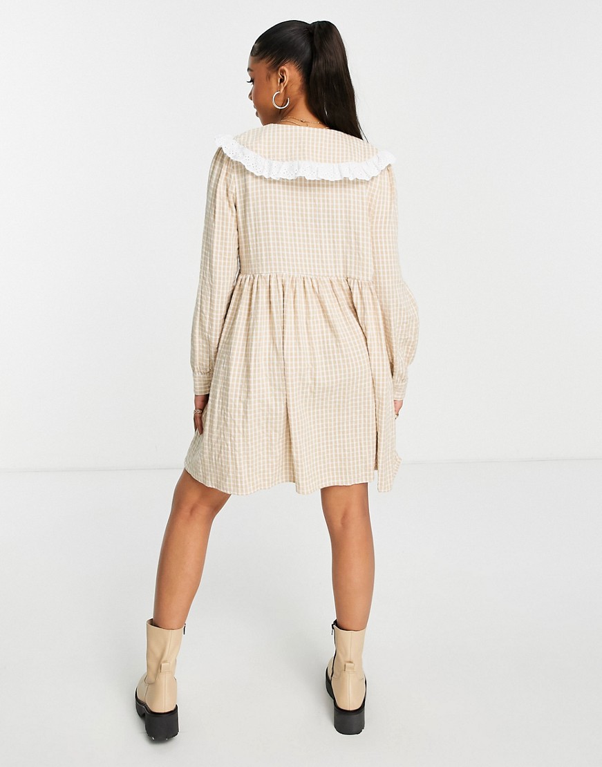 Lola May beżowa luźna sukienka mini z kołnierzykiem kratka vichy retro 38