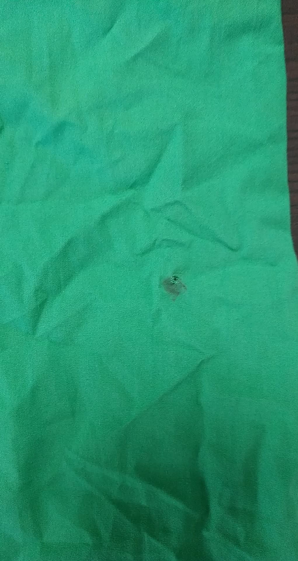 - defekt wyświecony materiał na prawym rękawie, dziurka i zabrudzenie z tyłu po prawej stronie