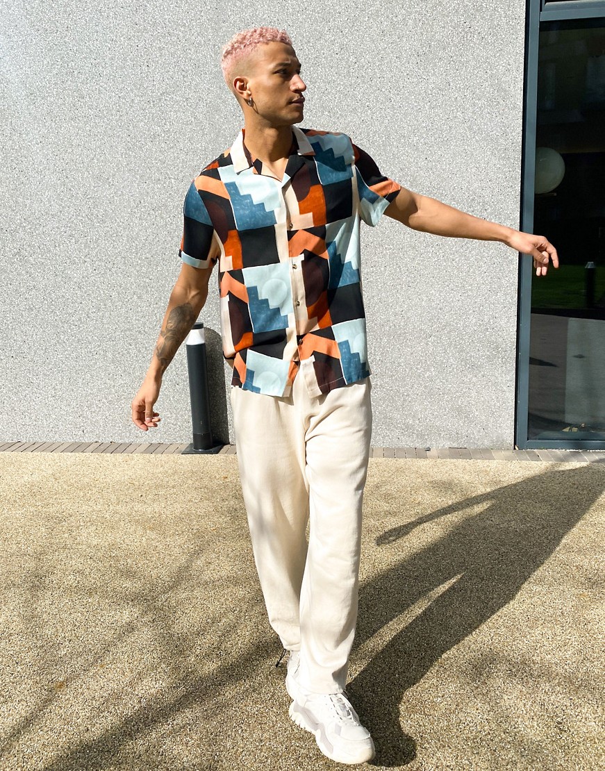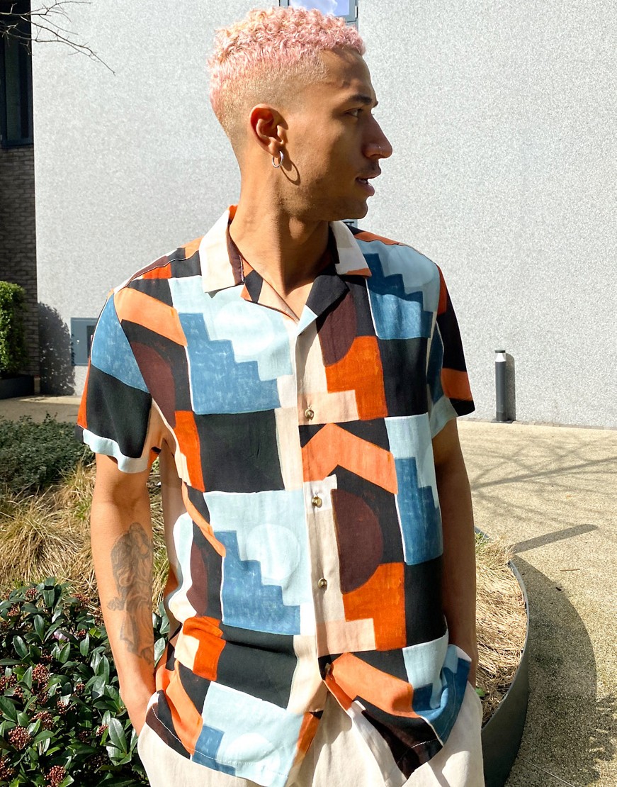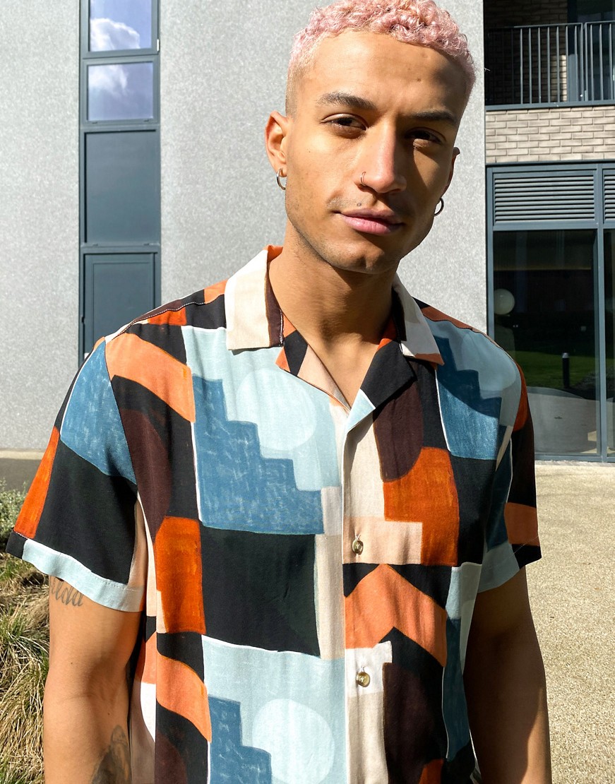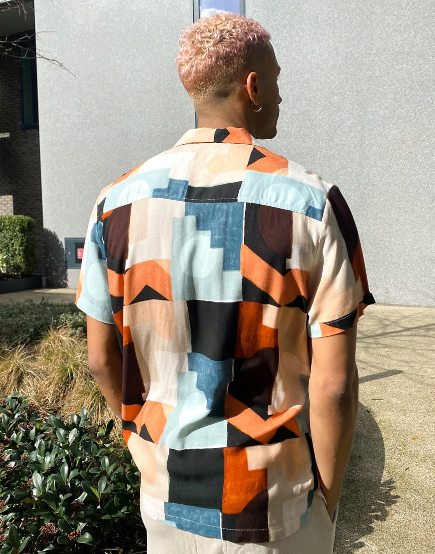 Luźna brązowa koszula z abstrakcyjnym nadrukiem L