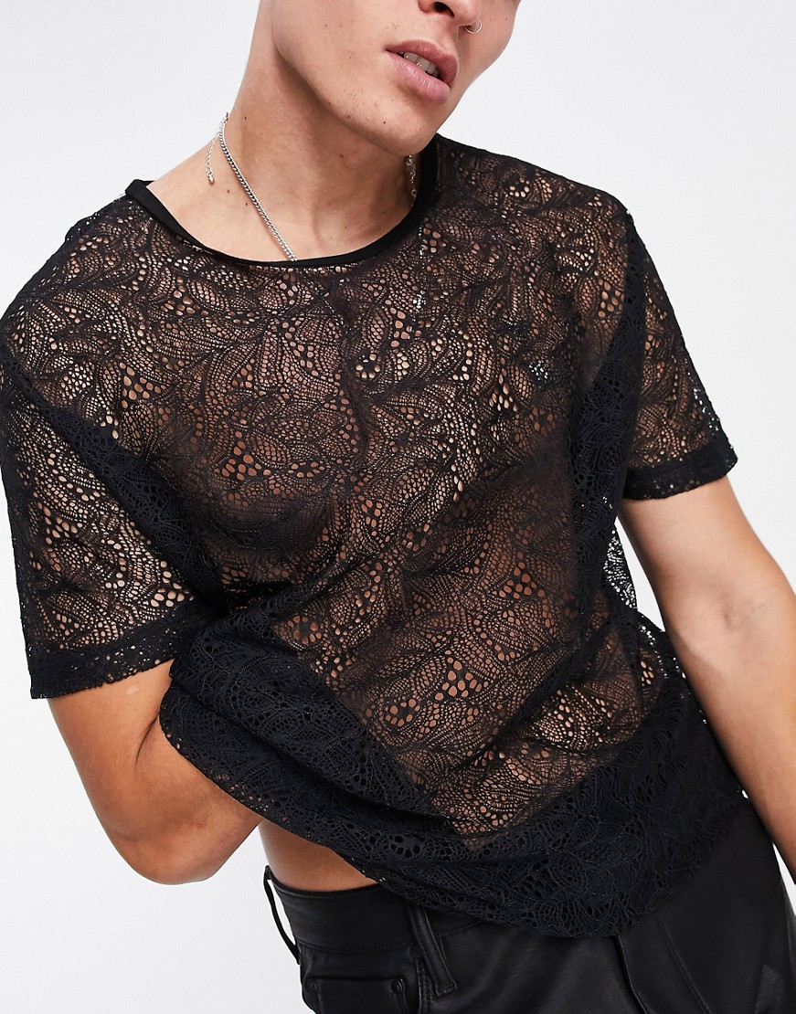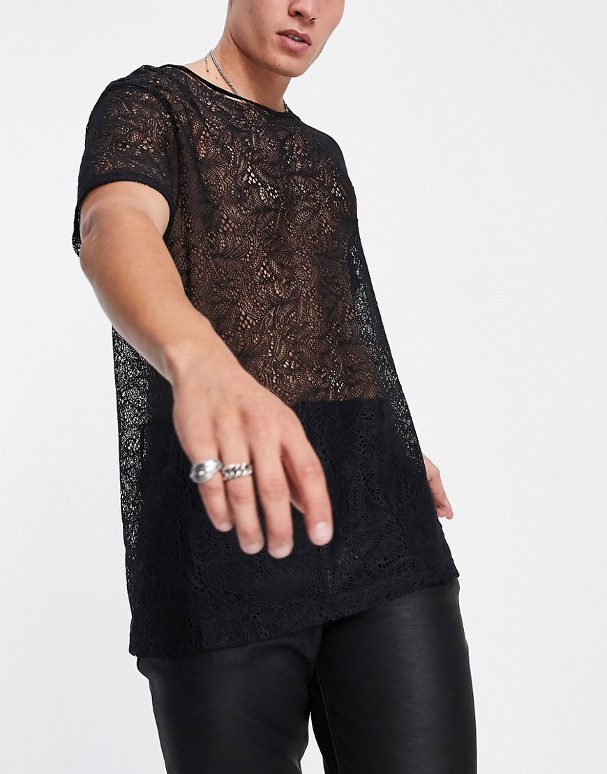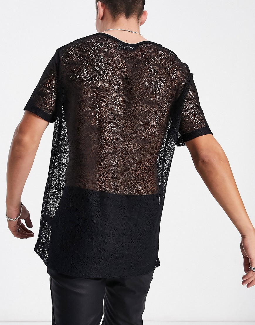 Luźny, czarny T-shirt z koronki z rozciętym dekoltem S