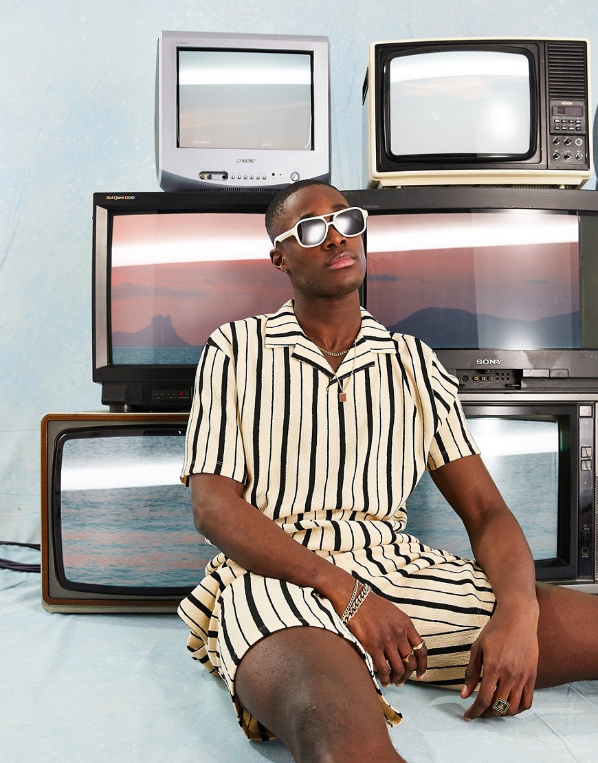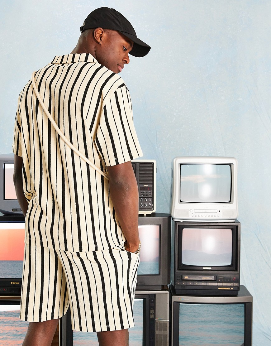 Luźny T-shirt polo z kołnierzykiem kubańskim w kolorze ecru w czarne paski L