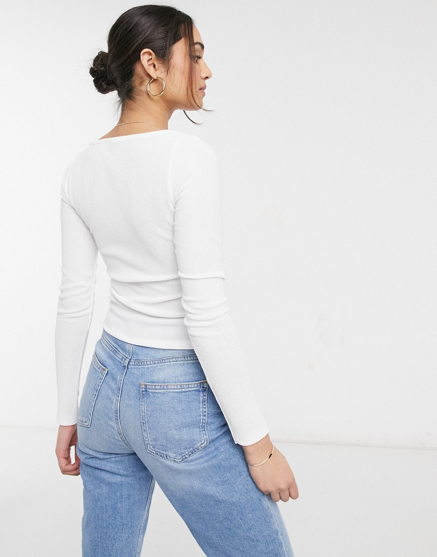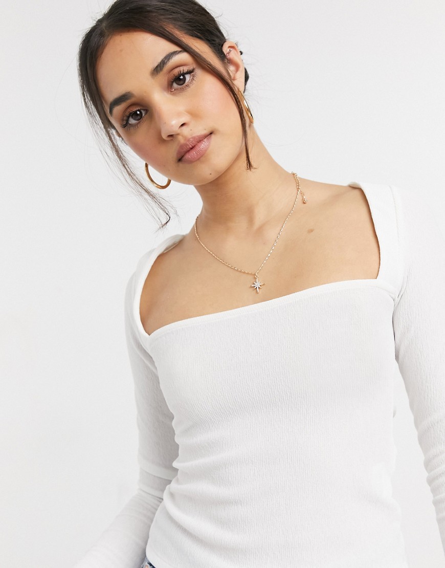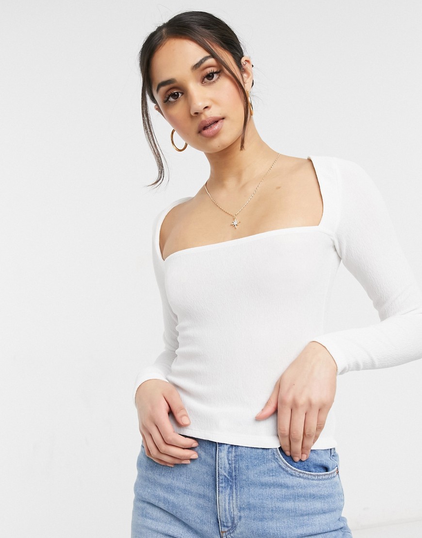 Marszczona bluzka z mocno wyciętym kwadratowym dekoltem i długim rękawem biała 36