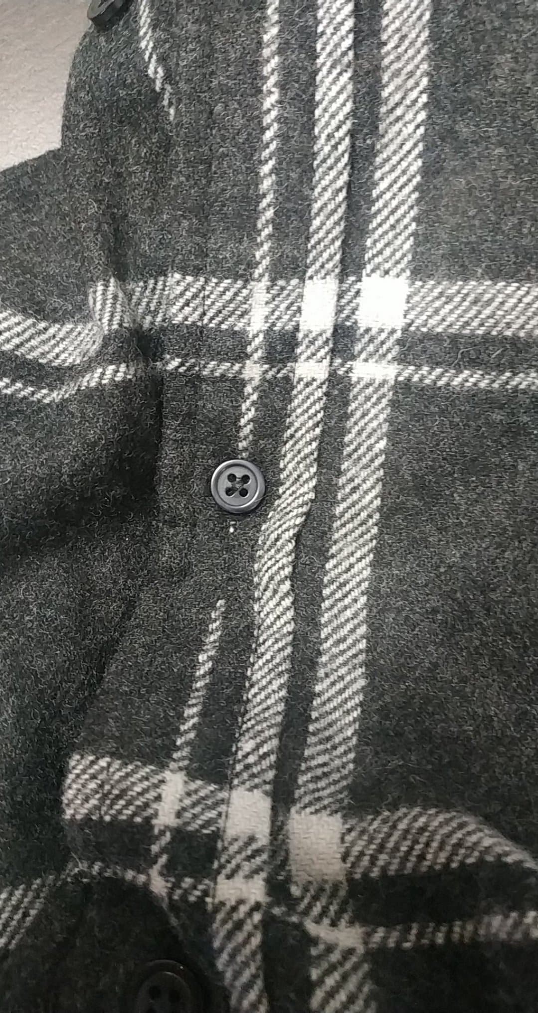 - Defekt po korekcie krawieckiej, podszyta dziurka przy 3 guziku, zdjęcie w galerii produktu