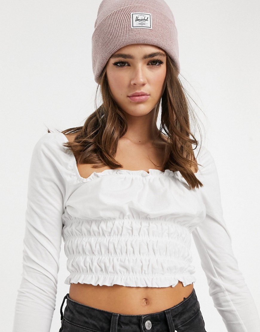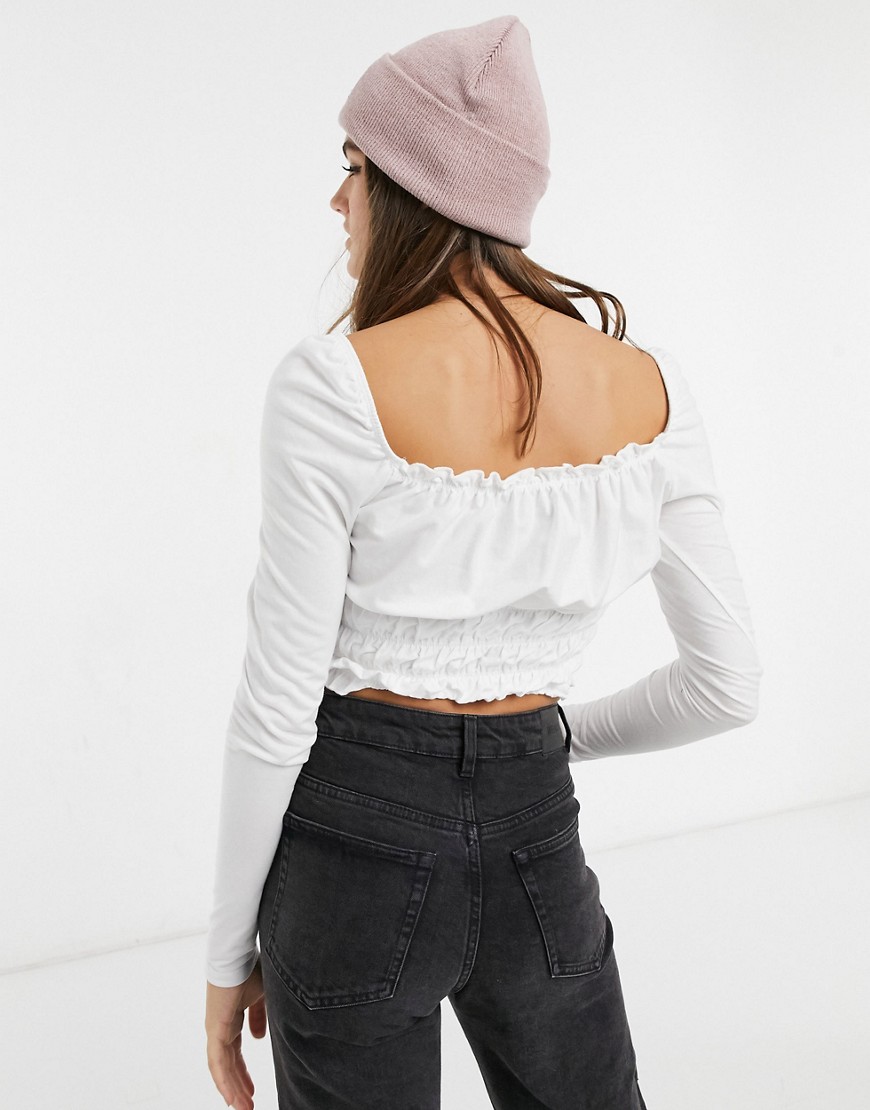 Miss Selfridge biały marszczony krótki top z długim rękawem 38