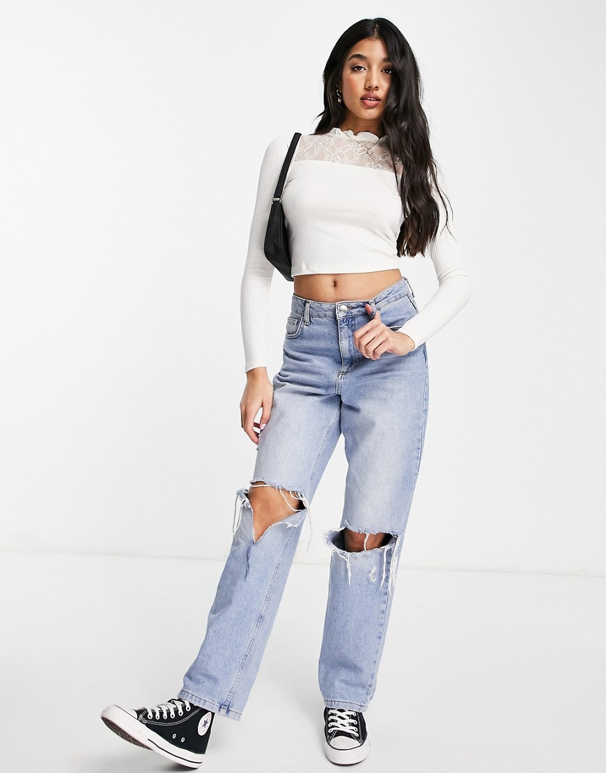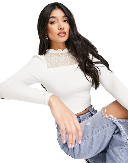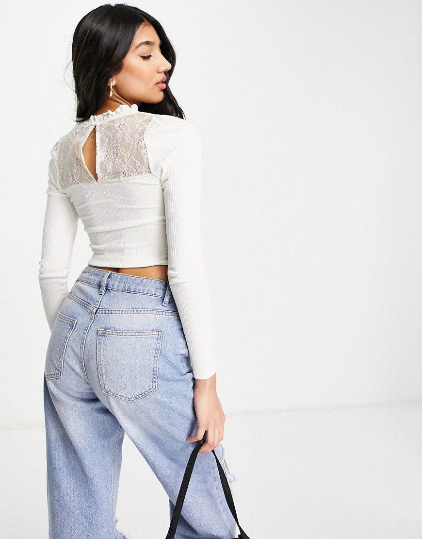 Miss Selfridge bluzka z długimi rękawami z koronkową wstawką i falbanką przy szyi 40