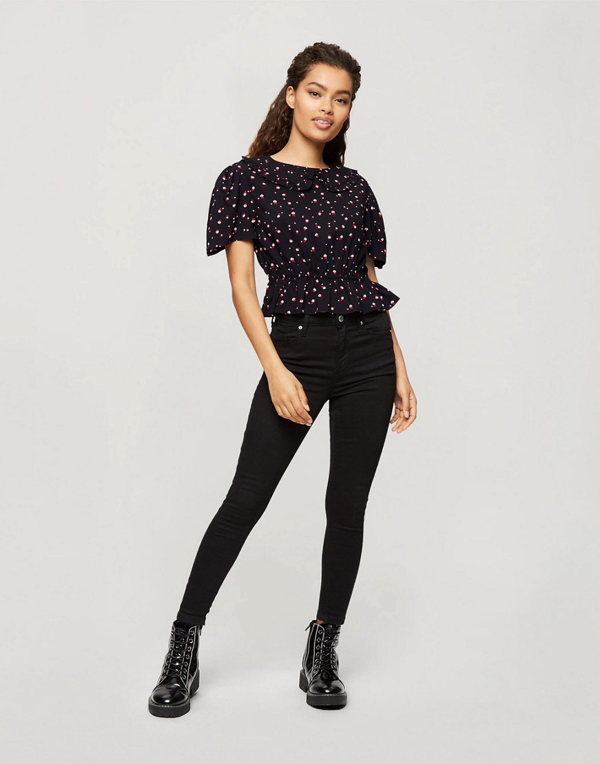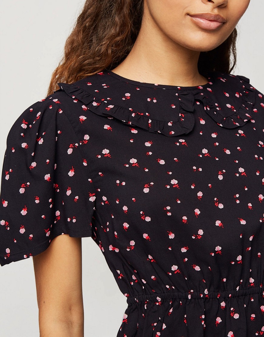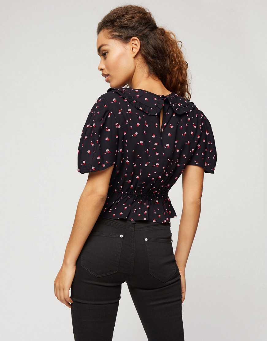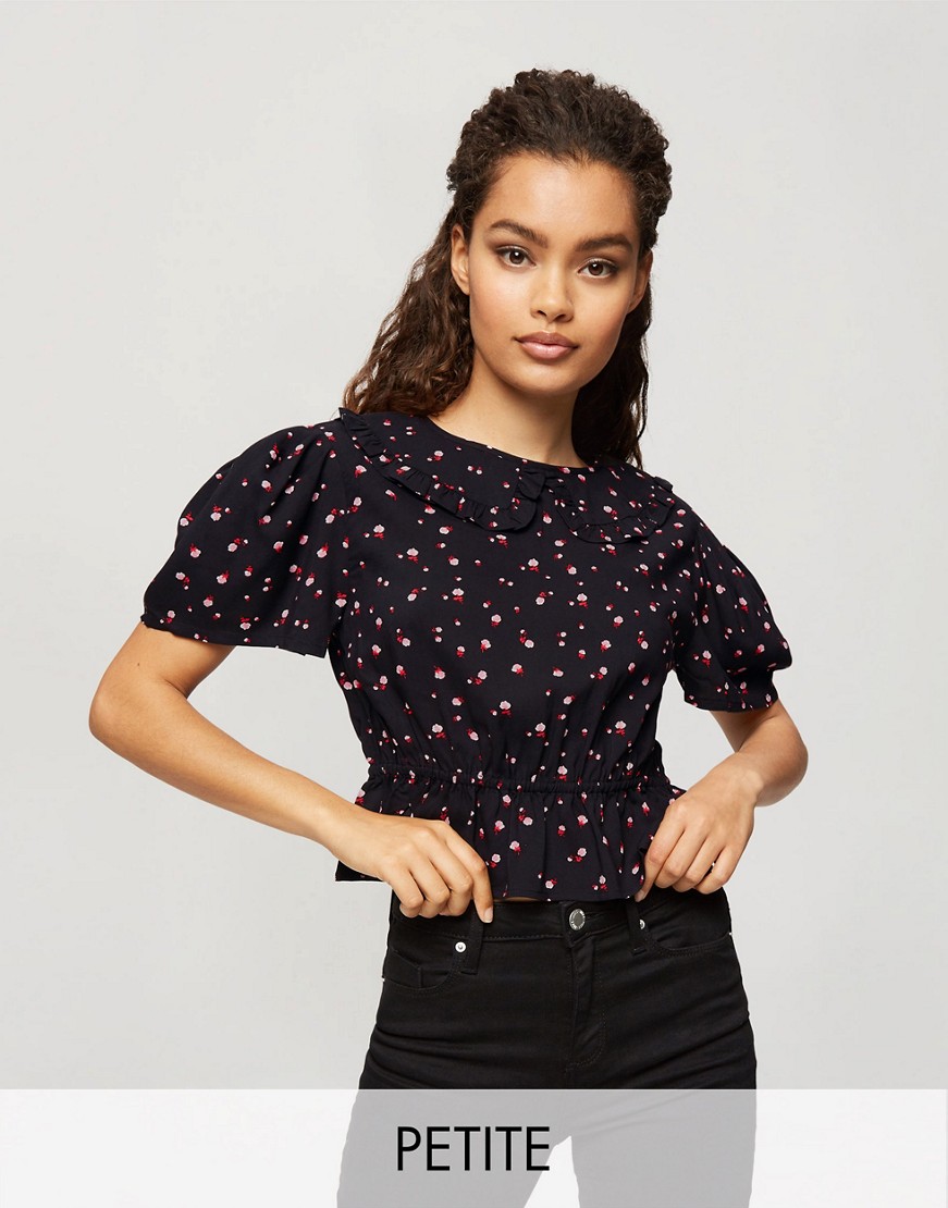 Miss Selfridge Petite czarna bluzka z kołnierzem w kwiaty 38
