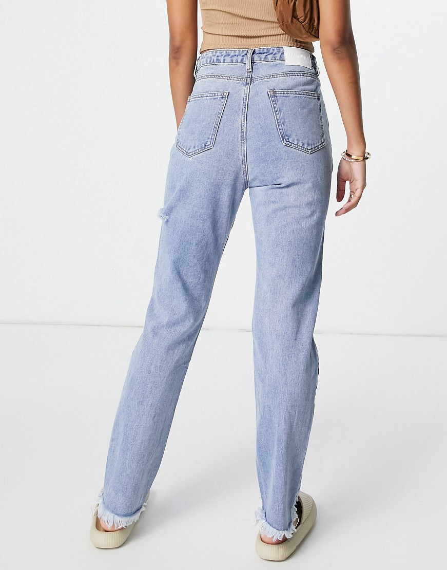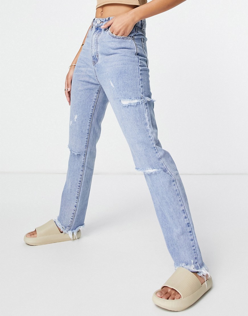 Missguided jasnoniebieskie jeansy damskie z podwyższonym stanem i rozdarciami defekt 44
