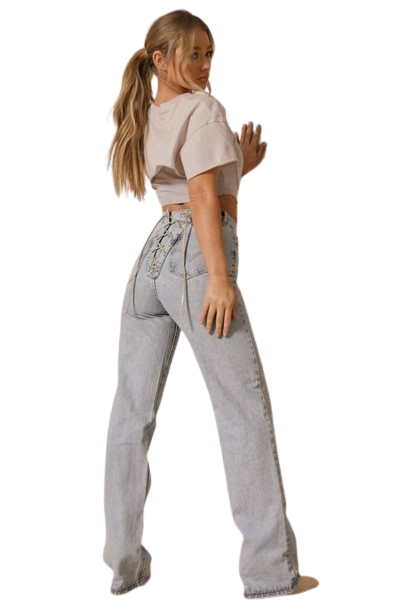 Misspap niebieskie jeansy wide leg sznurowane z tyłu wysoki stan defekt 40