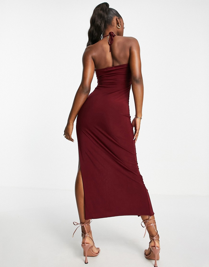 Missyempire bordowa sukienka maxi z rozcięciem i marszczeniami 32