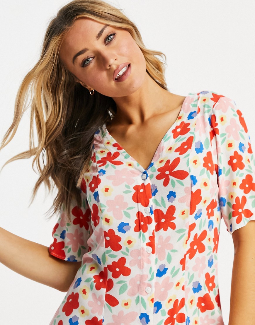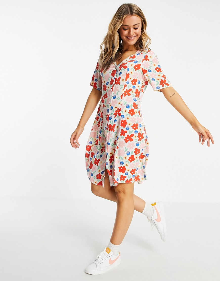 Luźna sukienka mini w kwiaty zapinana na guziki na wiosnę XL
