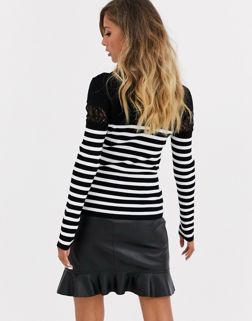 Morgan czarny sweter w paski z kołnierzykiem i wstawką z koronki XS