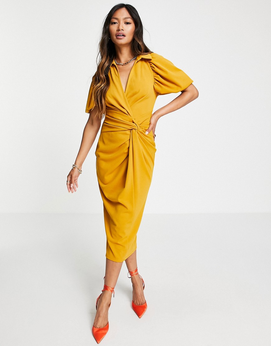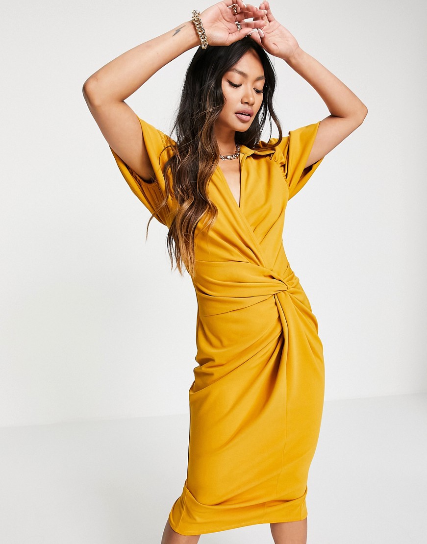 Musztardowa sukienka kopertowa midi z ozdobnym węzłem 46