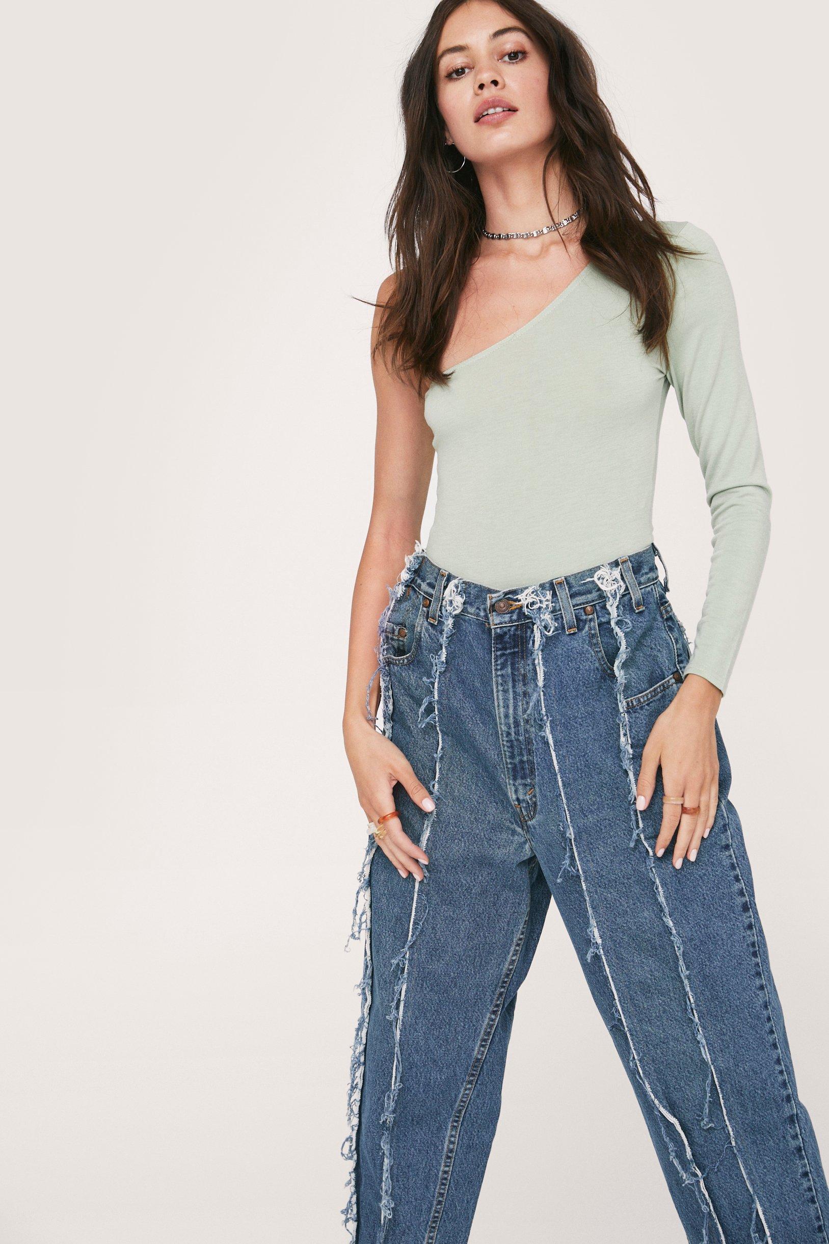 • surowe, postrzępione przeszycia wzdłuż nogawki