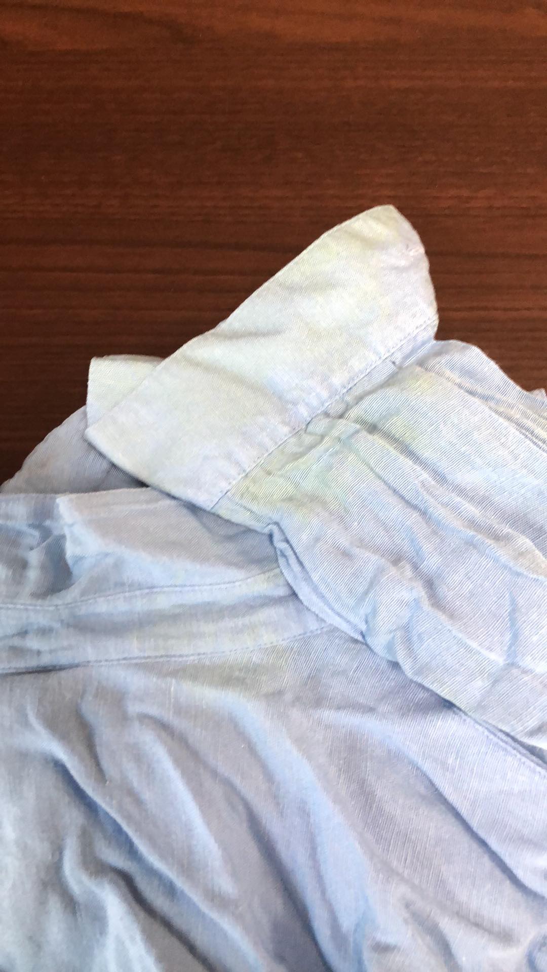 - Defekt przebarwienia na całości (tył okolice dekoltu, rękaw, przód okolice guzików), zdjęcie w galerii produktu
