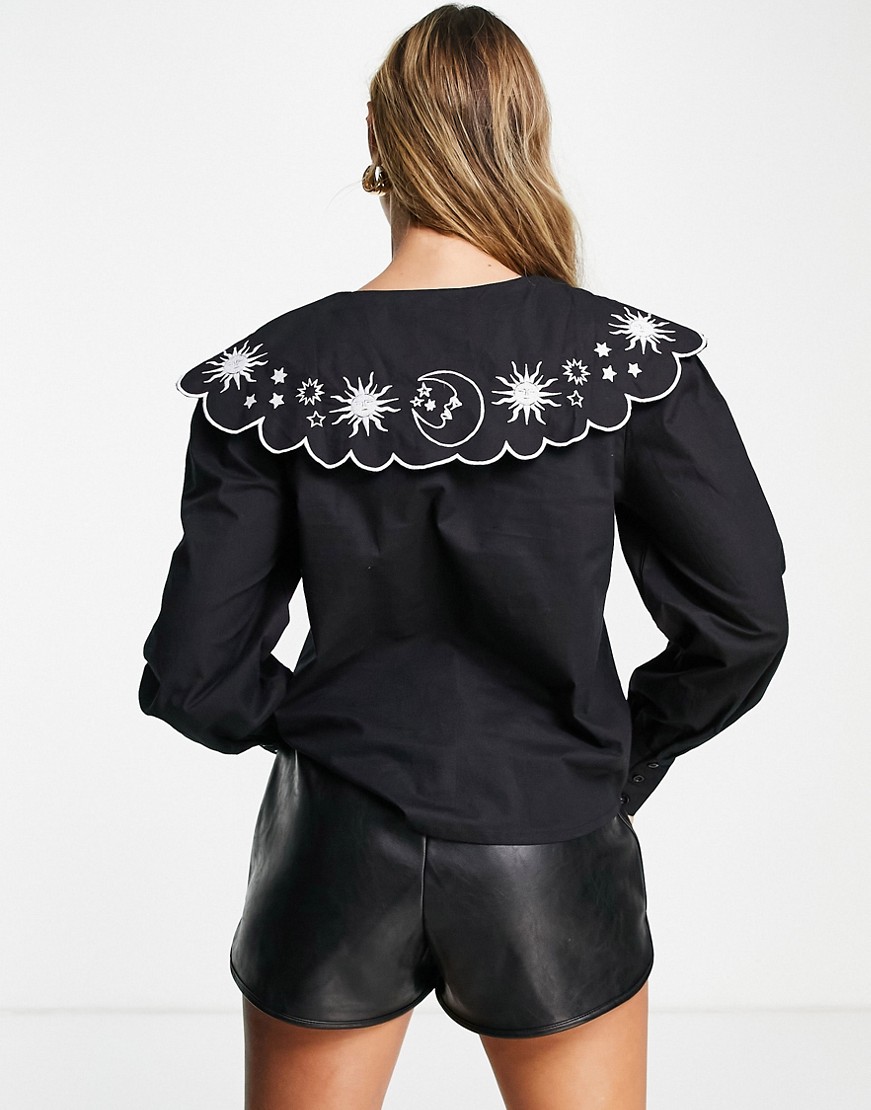 Neon Rose czarna damska bluzka duży kołnierz astrologiczny haft S
