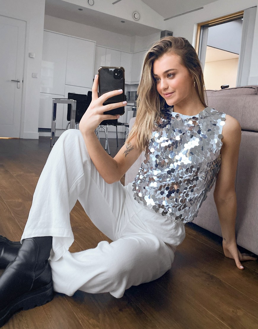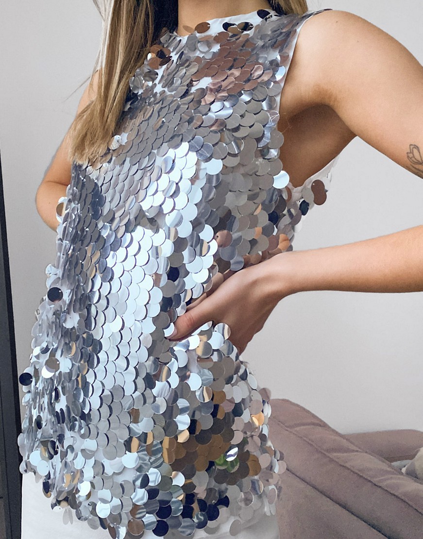 Never Fully Dressed srebrna bluzka z zabudowanym dekoltem z dużymi okrągłymi cekinami 38