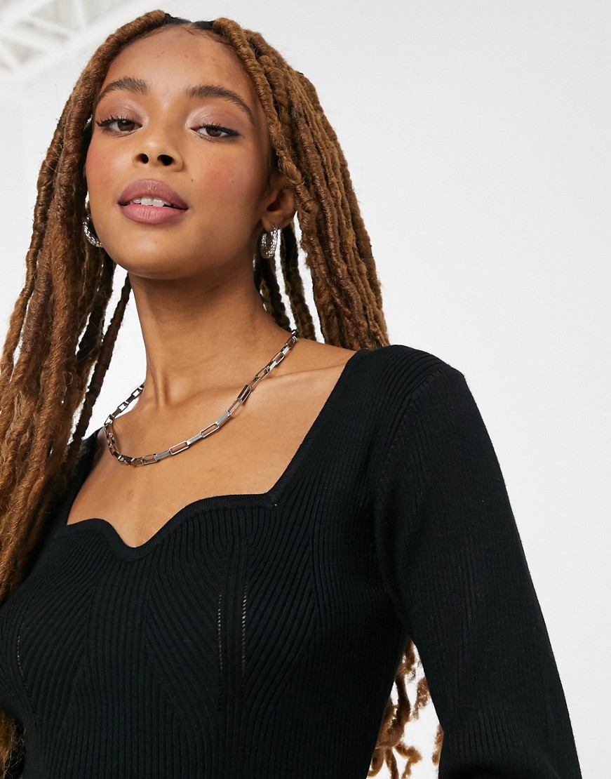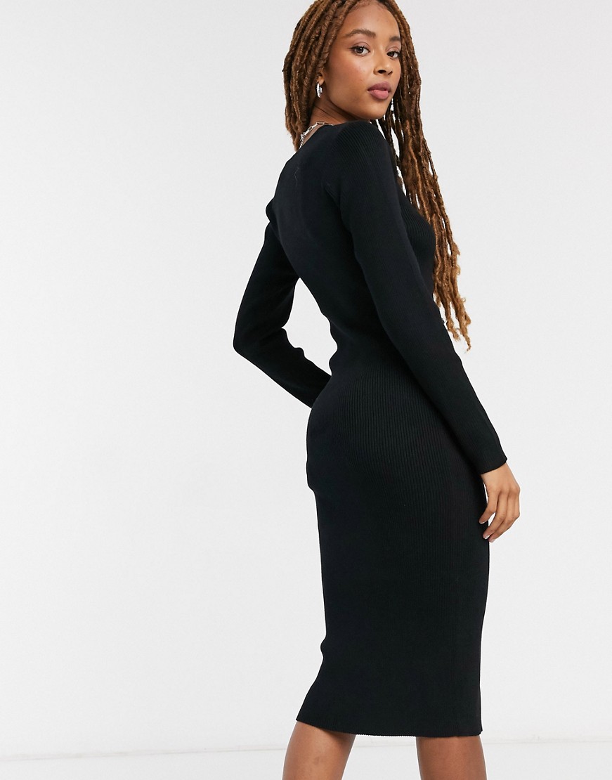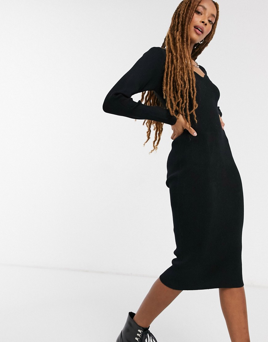 New Look czarna dzianinowa prążkowana sukienka midi dekolt serce tuba 38