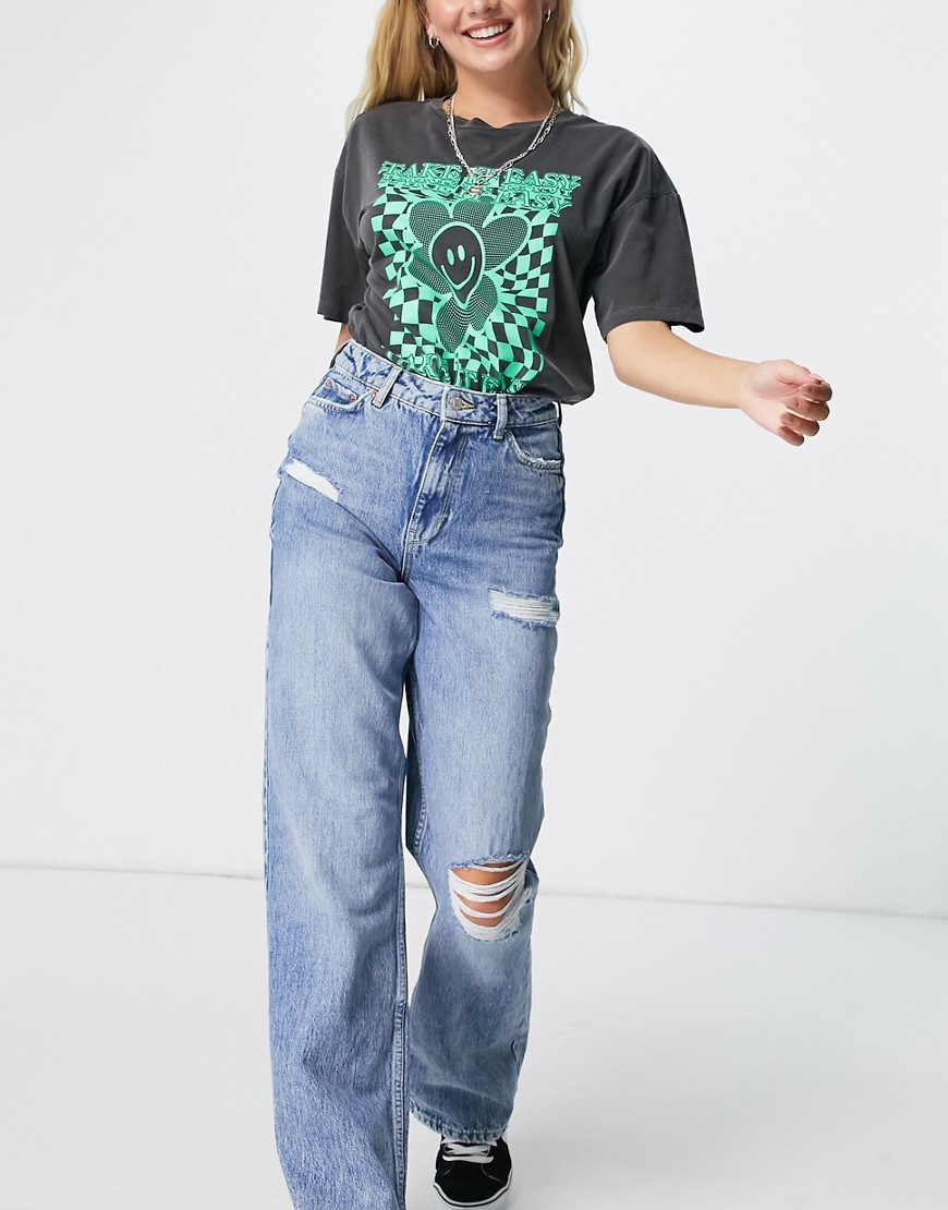 New Look niebieskie jeansy z długimi prostymi nogawkami i rozdarciam defekt L