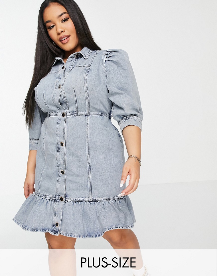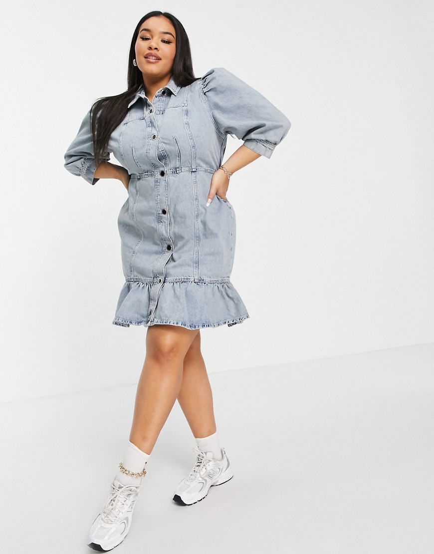 Niebieska jeansowa sukienka koszulowa z falbanką 46