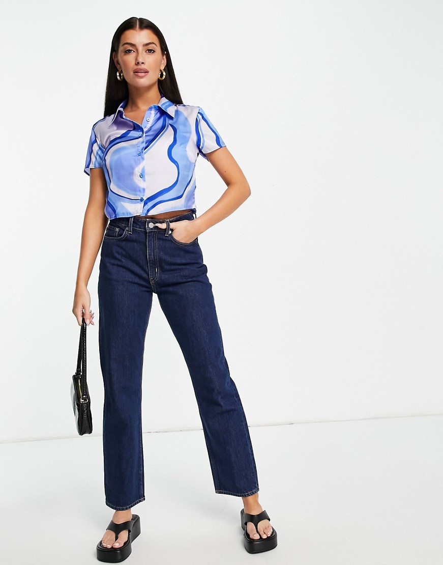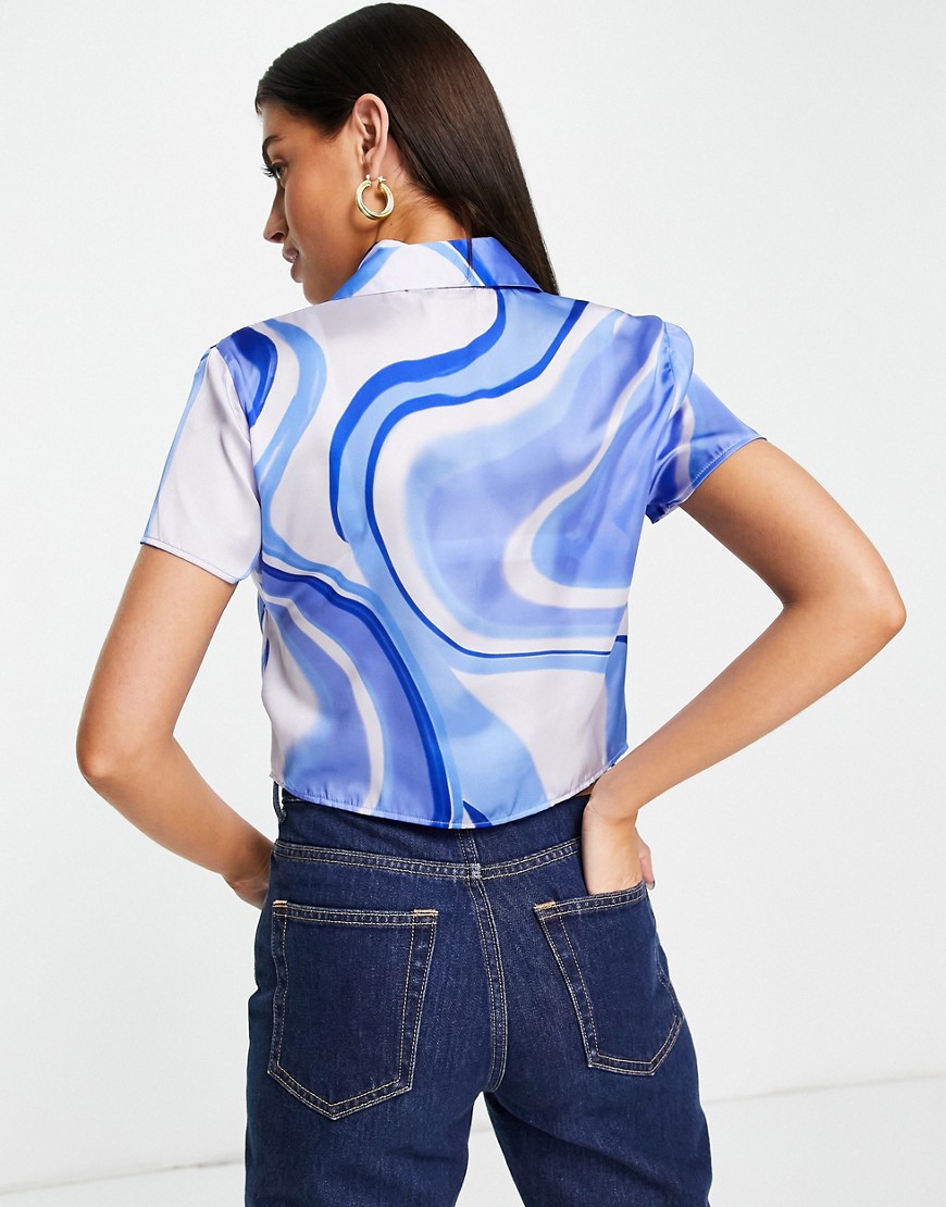 Niebieska koszula damska z krótkimi rękawami i abstrakcyjnym wzorem 46