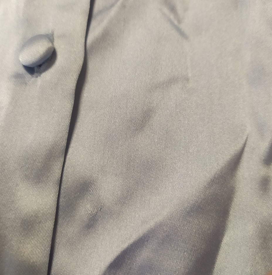 - Defekt – zaciągnięcie z przodu sukienki, przy plisie z guzikami, zdjęcie w galerii produktu