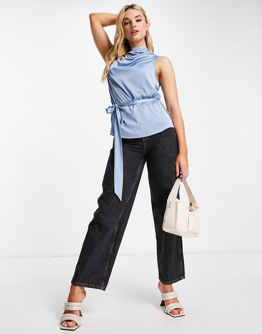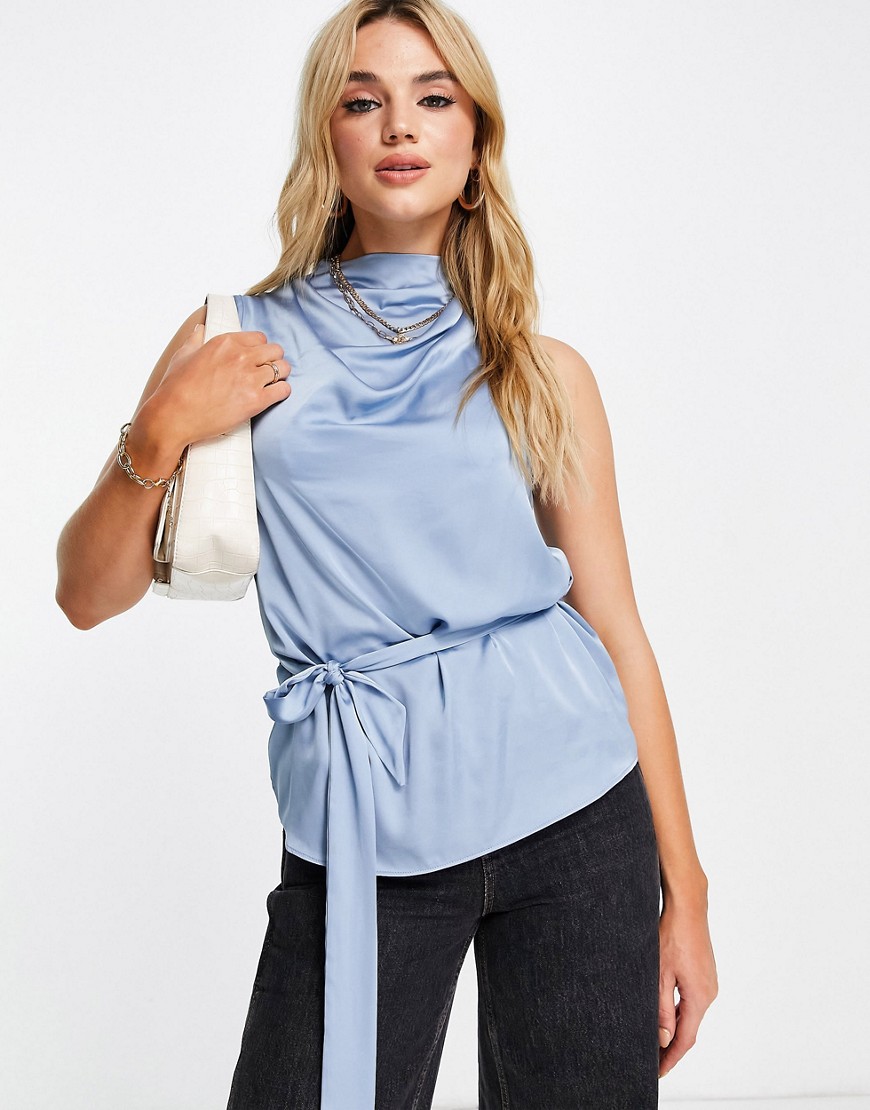 Niebieska satynowa bluzka bez rękawów z paskiem 40