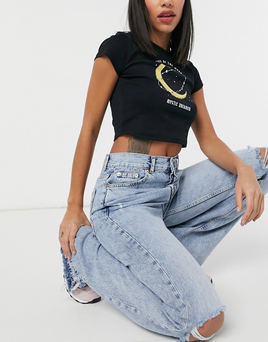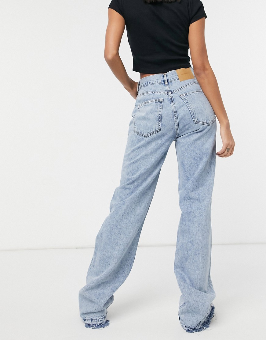 Niebieskie jeansy w stylu lat 90. z prostymi nogawkami, rozdarciami i surowym brzegiem 36
