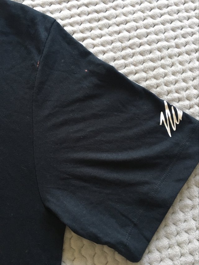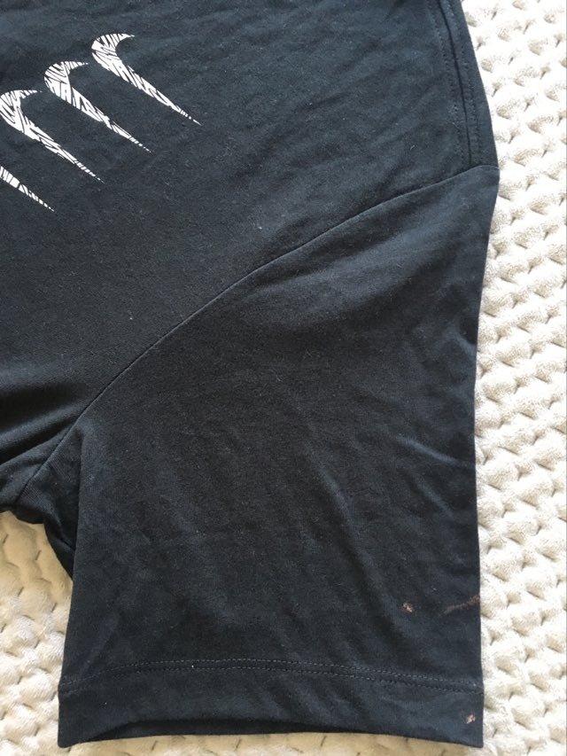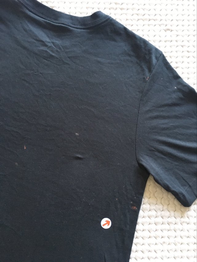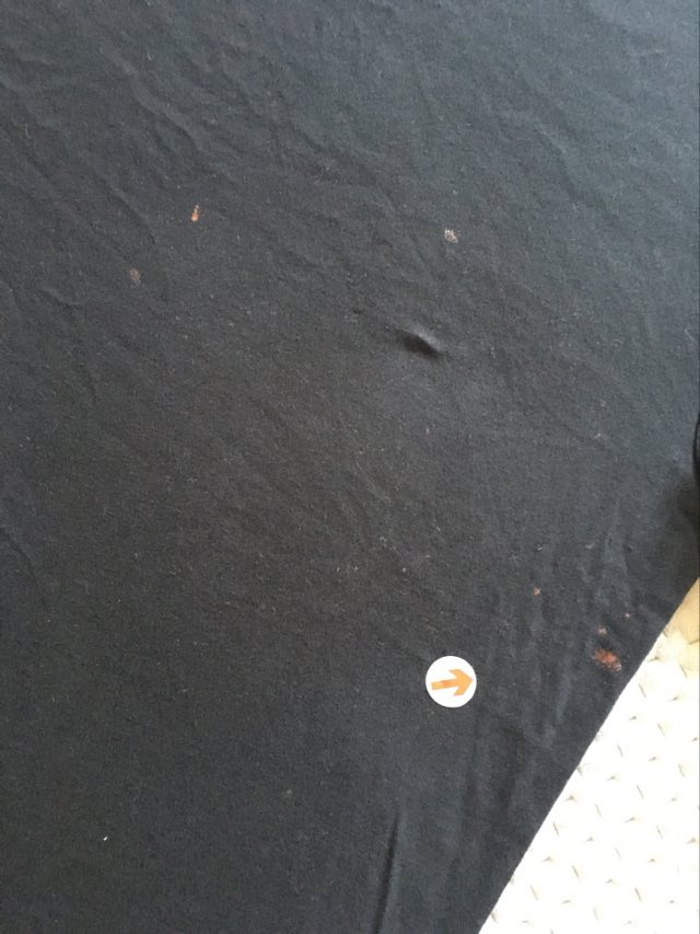 - Defekt: skaza materiału na prawym rękawie przód i tył oraz na plecach po prawej stronie – zdjęcia w galerii przedmiotu.