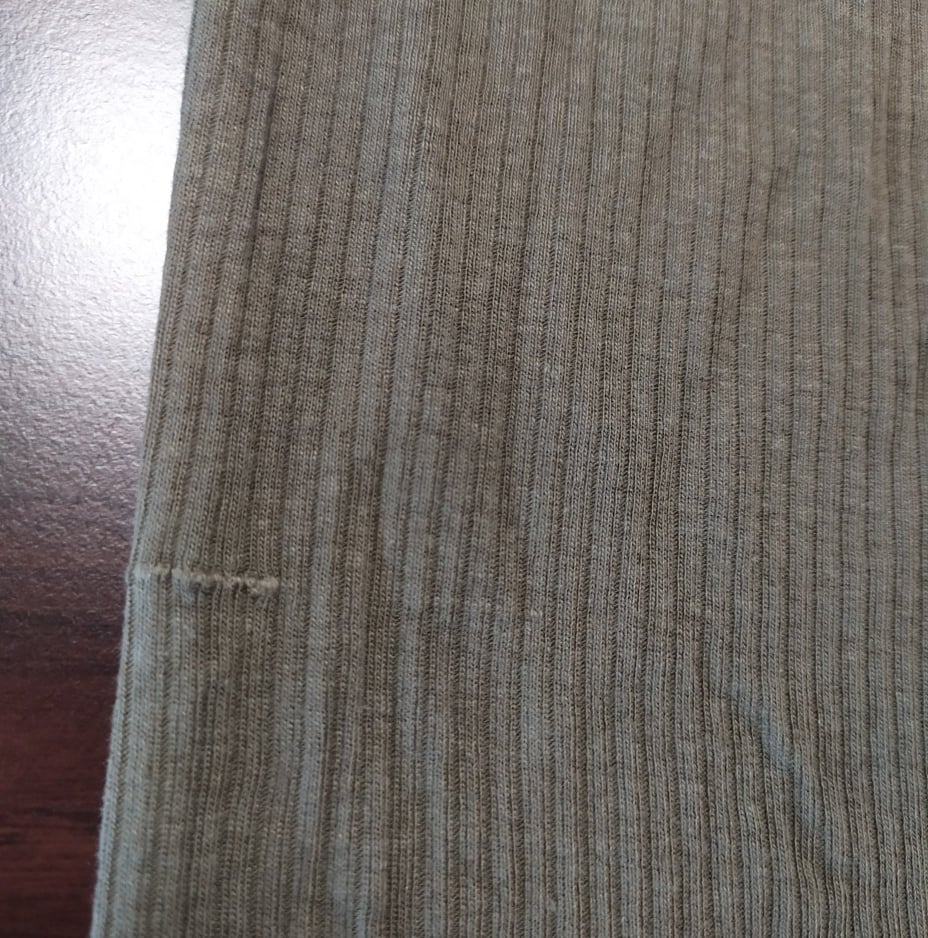 • Defekt : wada fabryczna, przeszycie przy szwie na nogawce, zdjęcie w galerii produktu