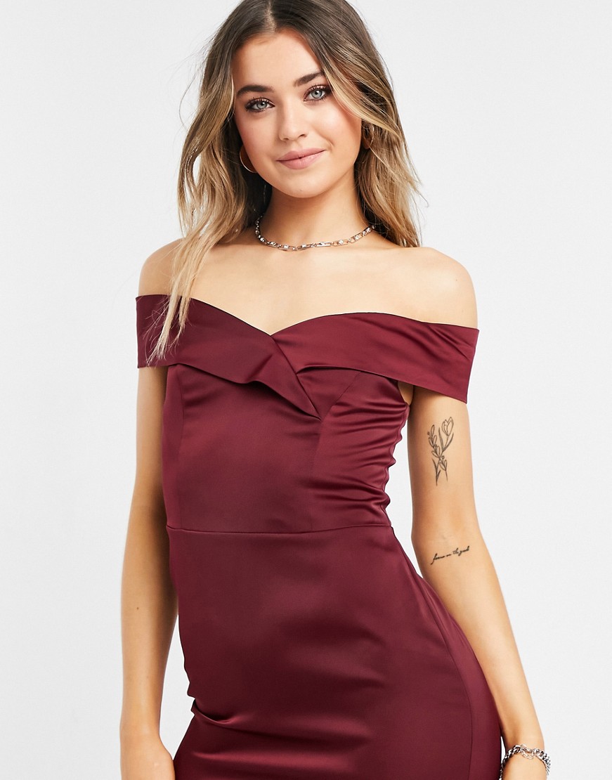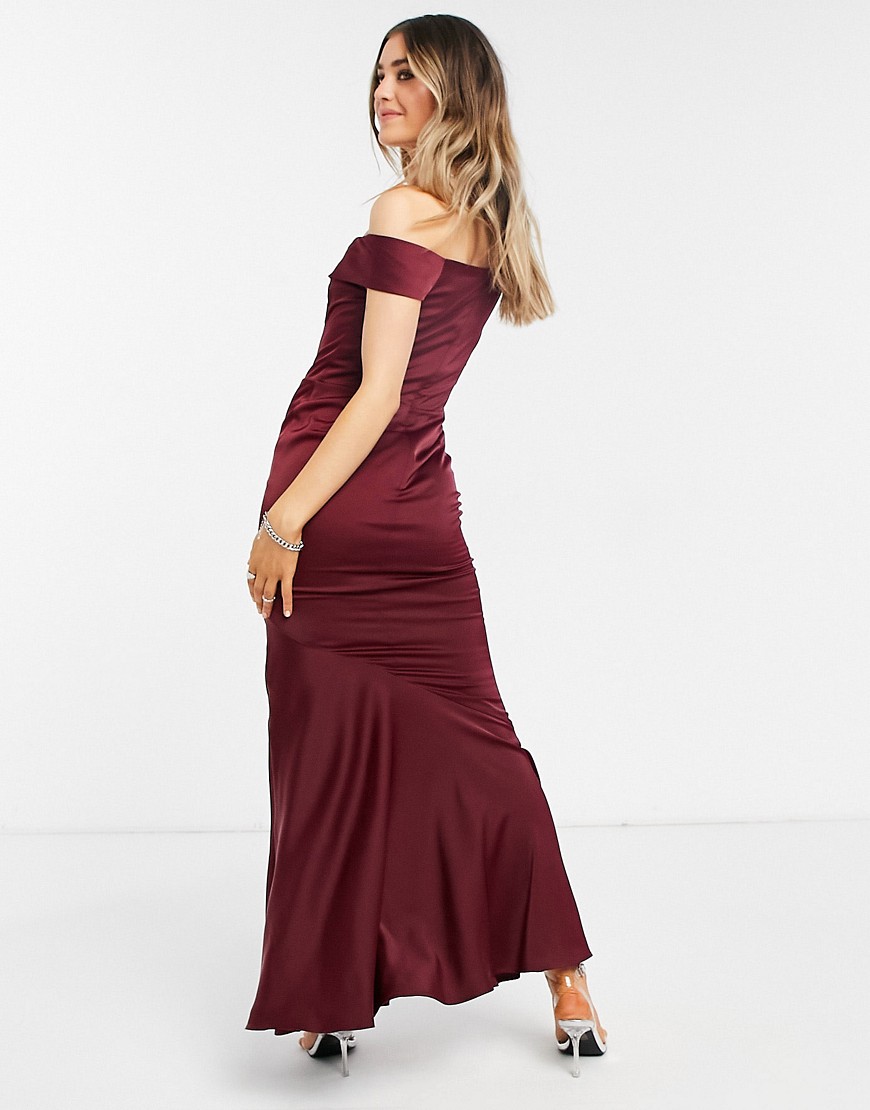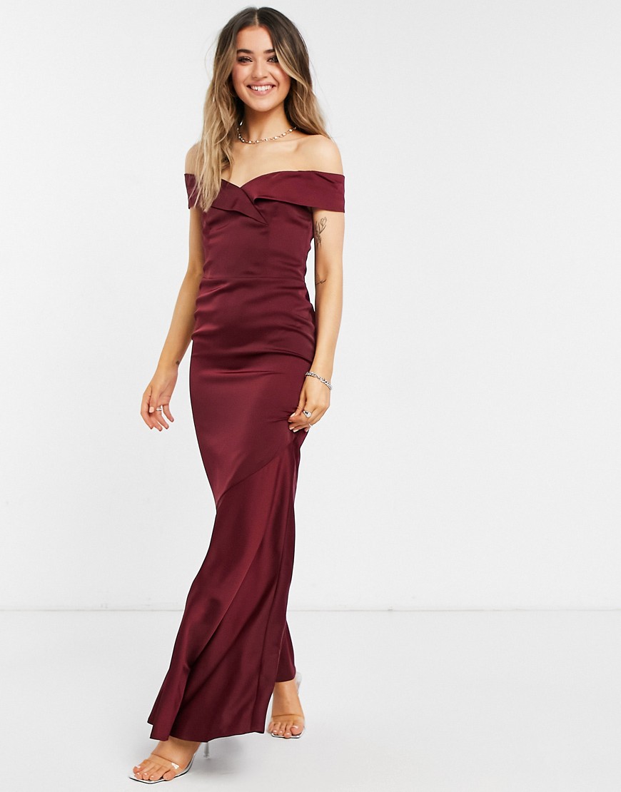 Oasis bordowa sukienka maxi o dopasowanym kroju z odkrytymi ramionami 44