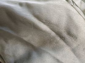 - defekt lekkie zaciągnięcie materiału i mało widoczna plamka po lewej stronie