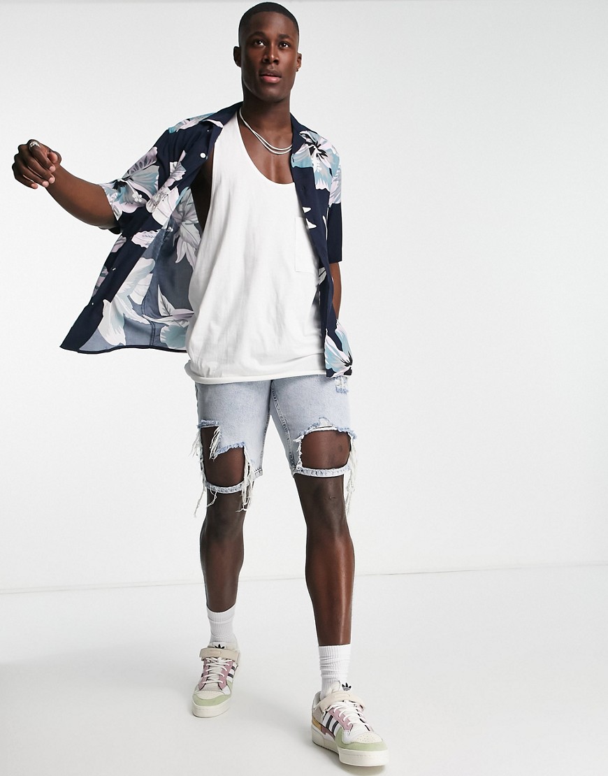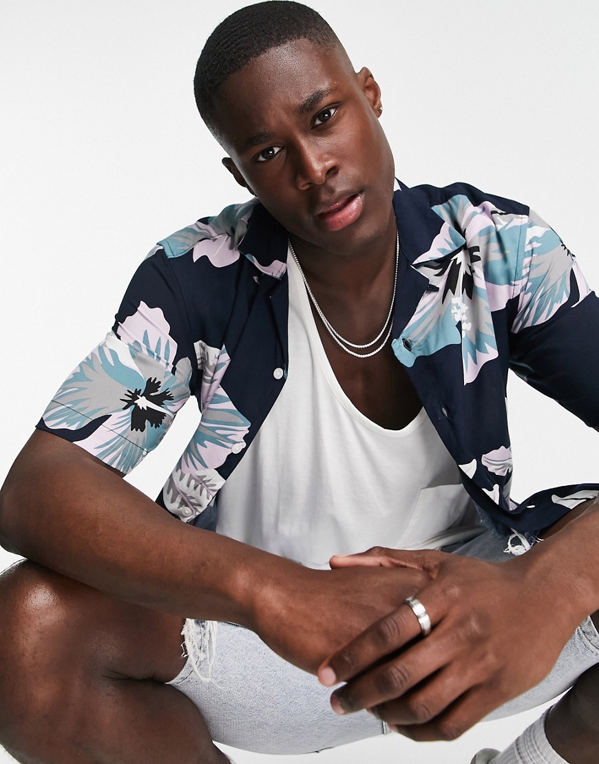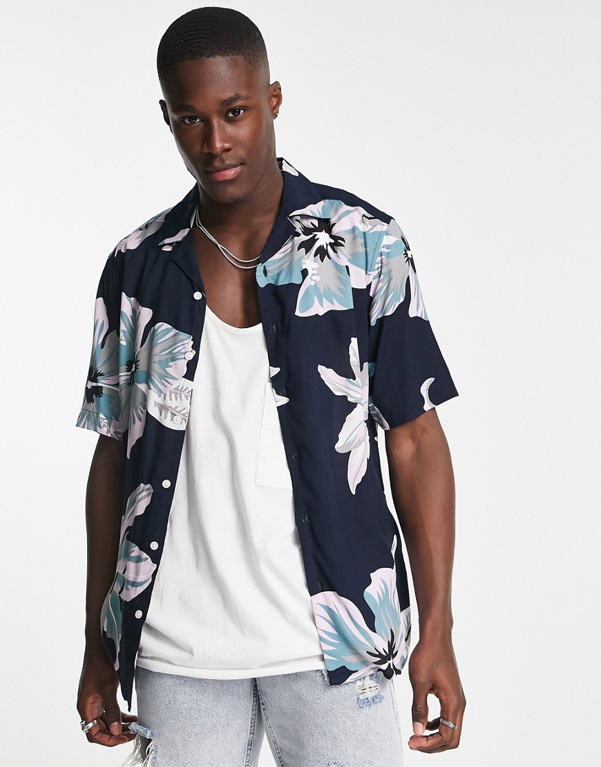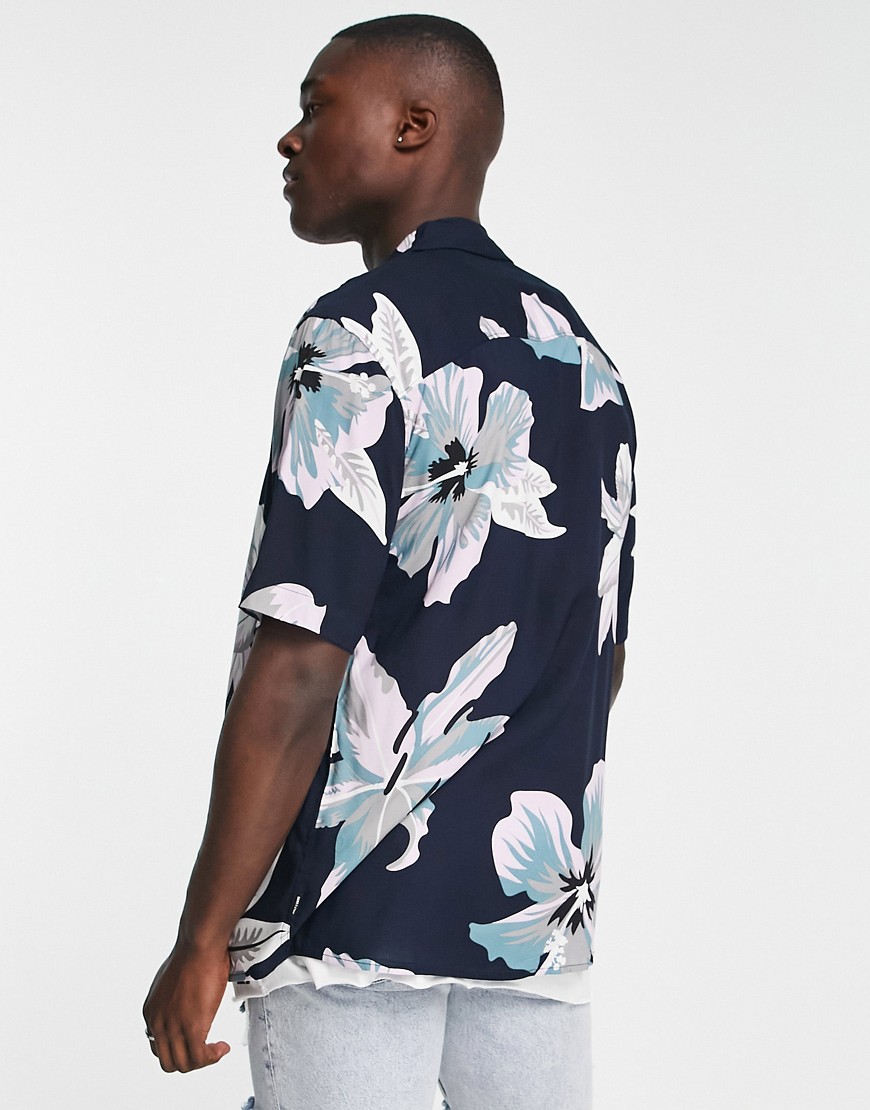 Only & Sons granatowa koszula w kwiaty z kołnierzykiem kubańskim defekt M