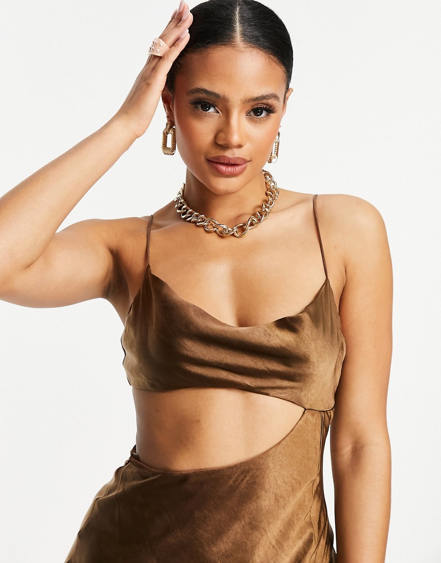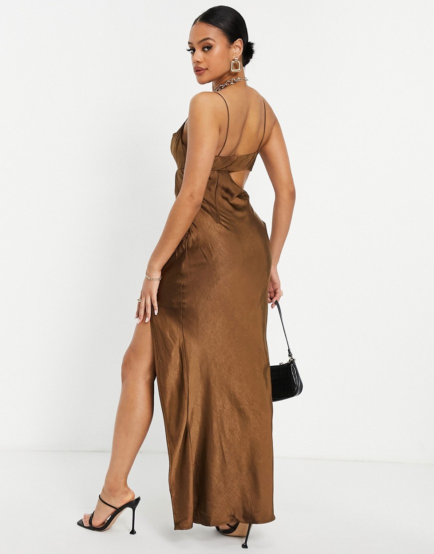 Parallel Lines Czekoladowa satynowa sukienka maxi z drapowanym dekoltem i wycięciem defekt 44