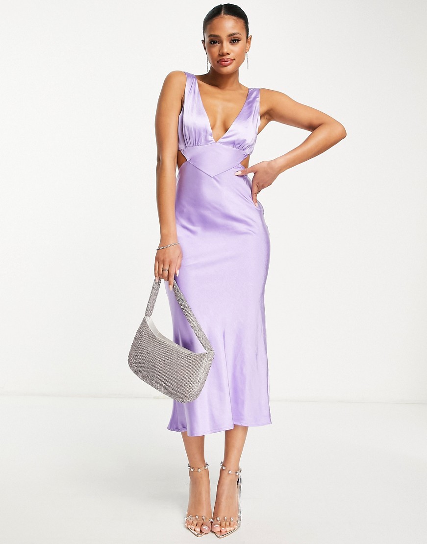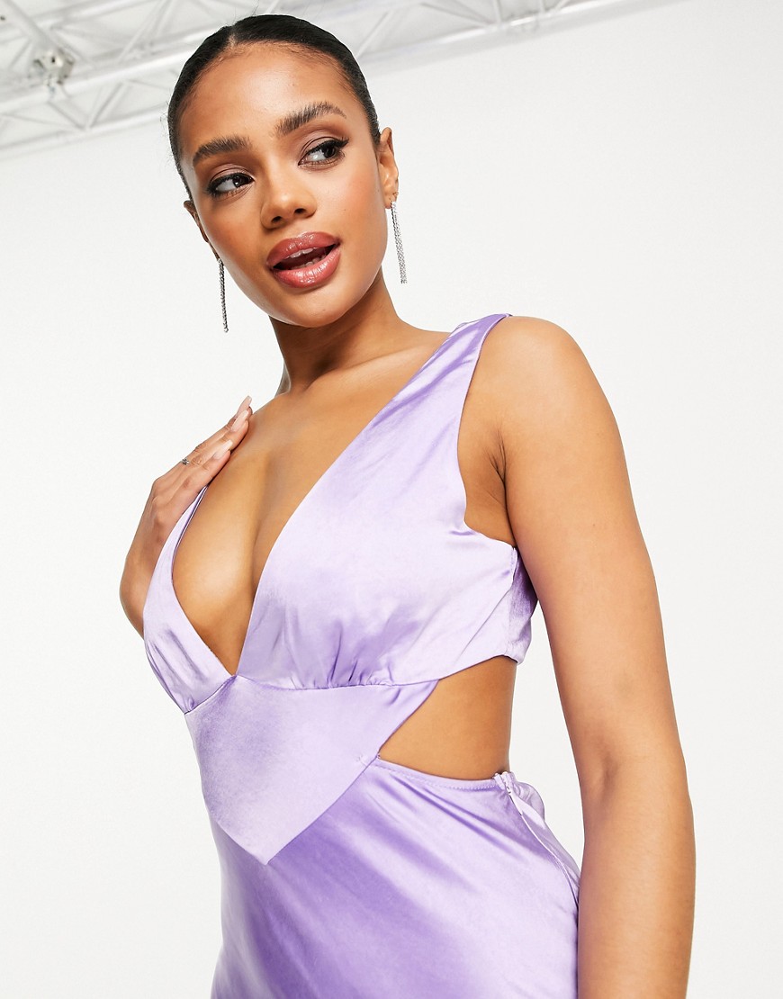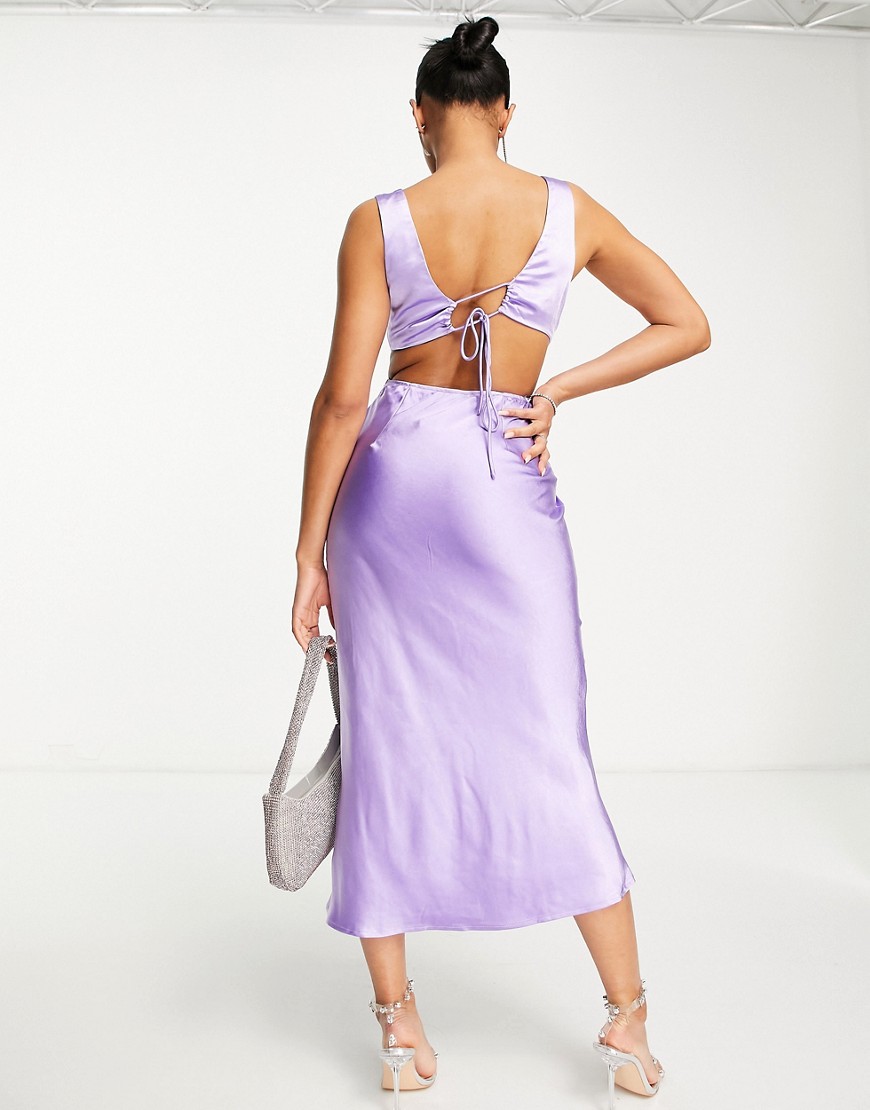 Parallel Lines Liliowa satynowa sukienka midi z wycięciem defekt 40