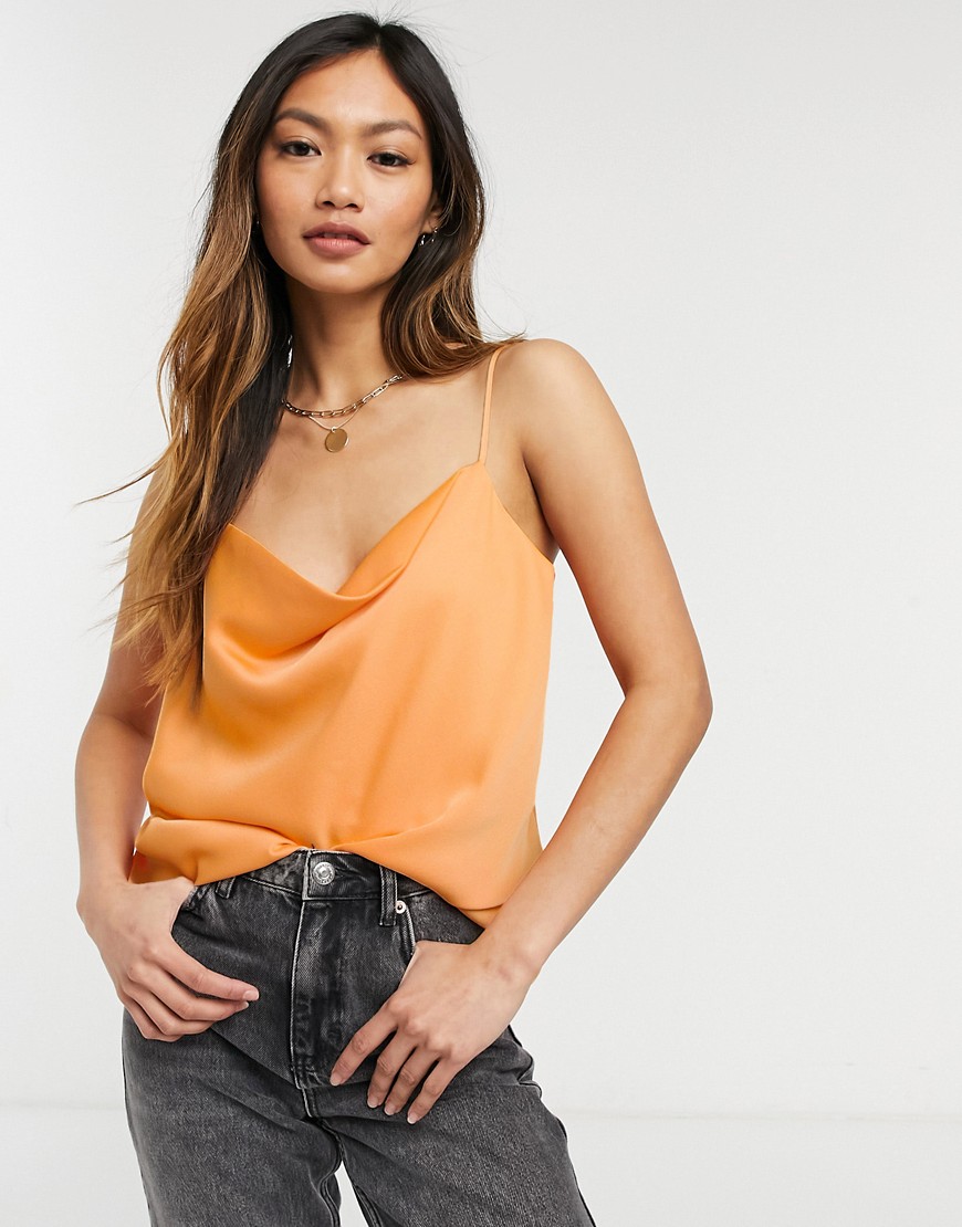Pomarańczowa satynowa bluzka na ramiączkach z lejącym dekoltem 40