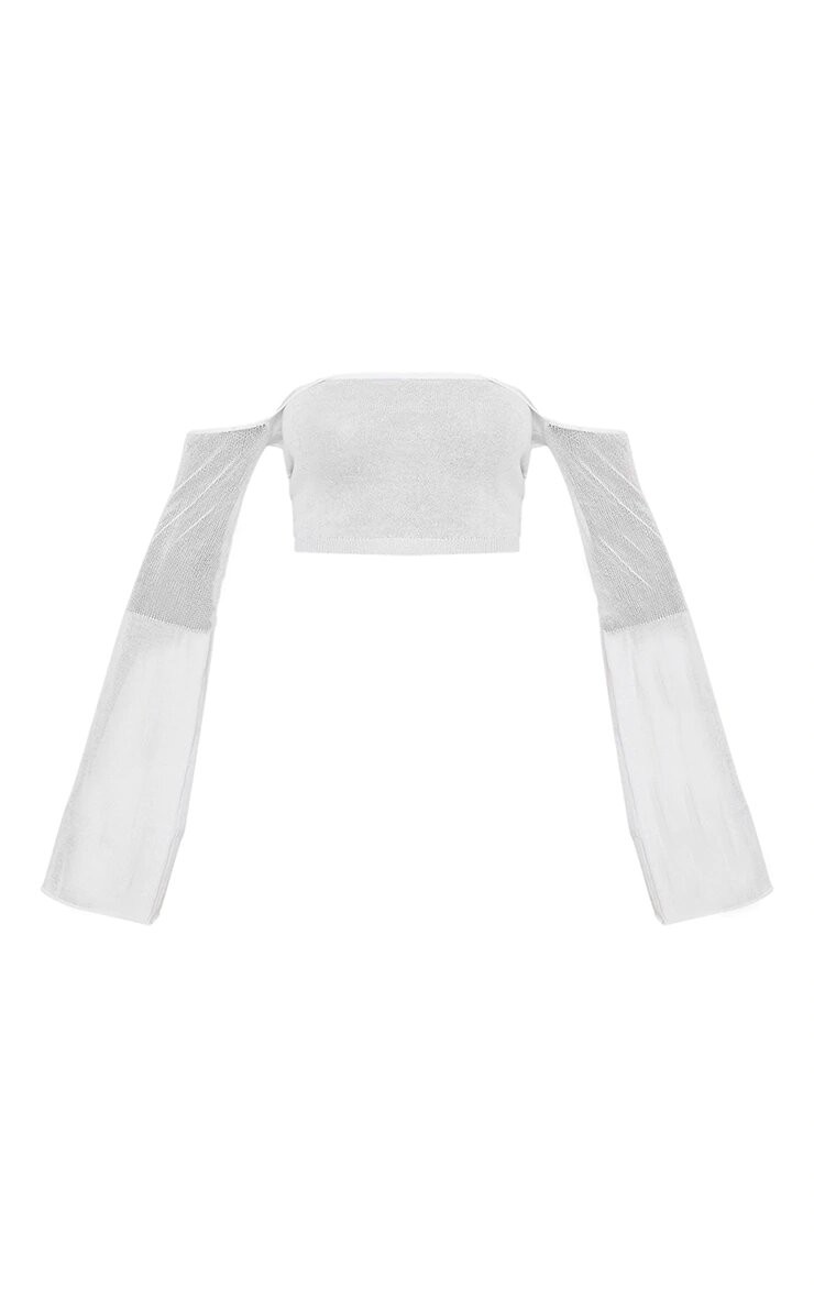 Zaktualizuj swoją dzianinową kolekcję dzięki temu topowi bardot. Wykonany z białej, lekkiej dzianiny z dekoltem, odsłoniętymi ramionami i długimi rękawami.