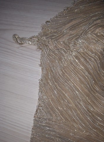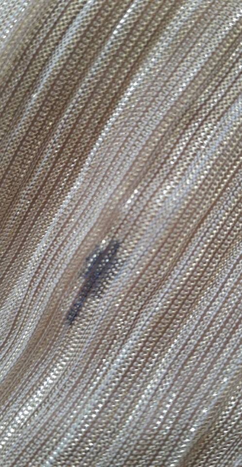 - Defekt: brak jednego sznurka po prawej stronie do sznurowania sukienki, zabrudzenie u dołu z tyłu (zdjęcie), postrzępiona u dołu