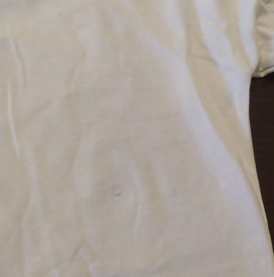 - Defekt : zielona nitka wkręcona w splot, tył koszulki, zdjęcie w galerii produktu