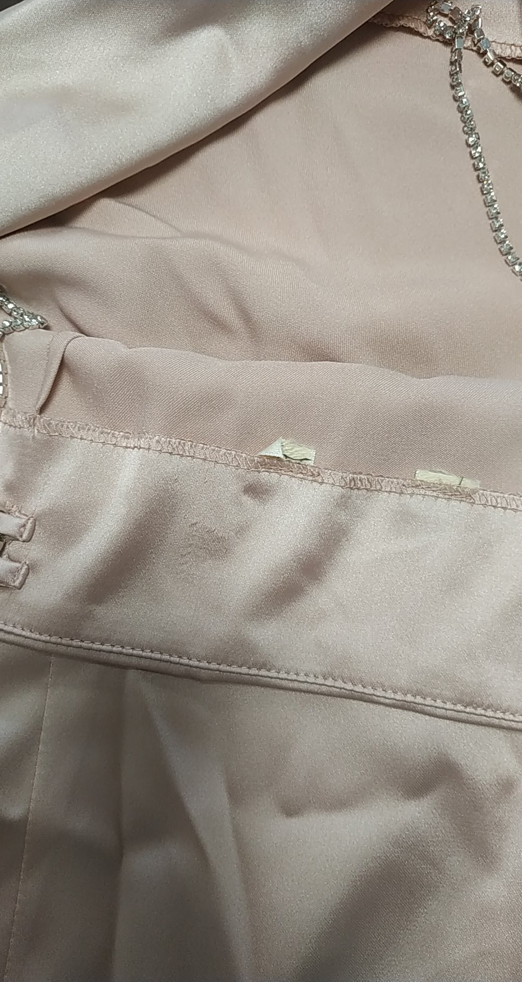 Pudroworóżowa satynowa sukienka midaxi z ramiączkami zdobionymi strasami defekt 38