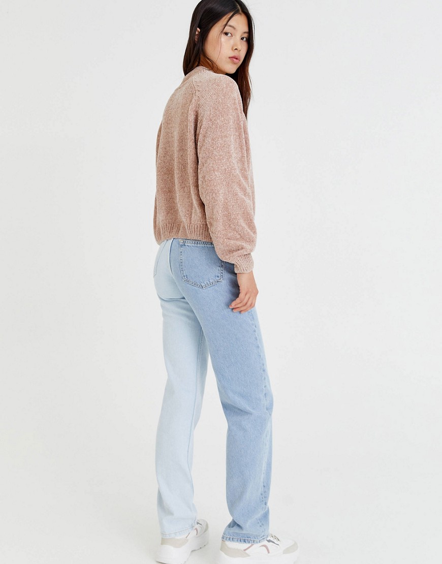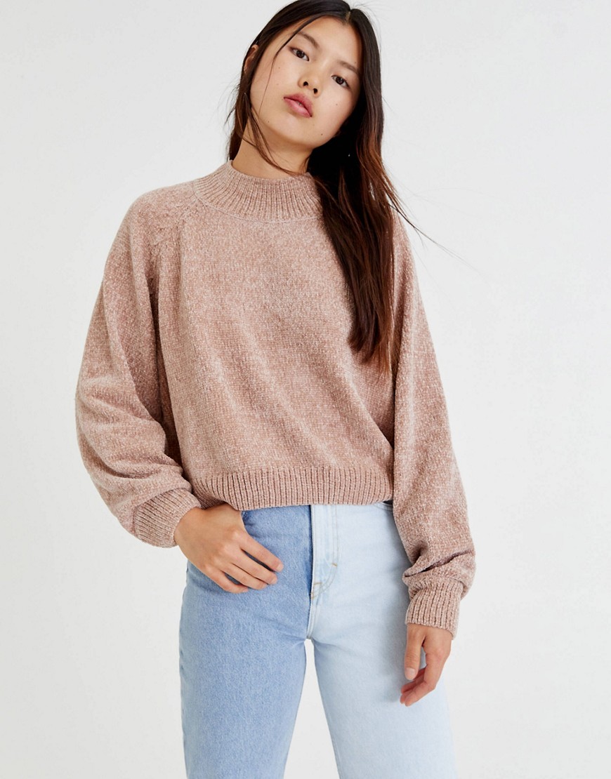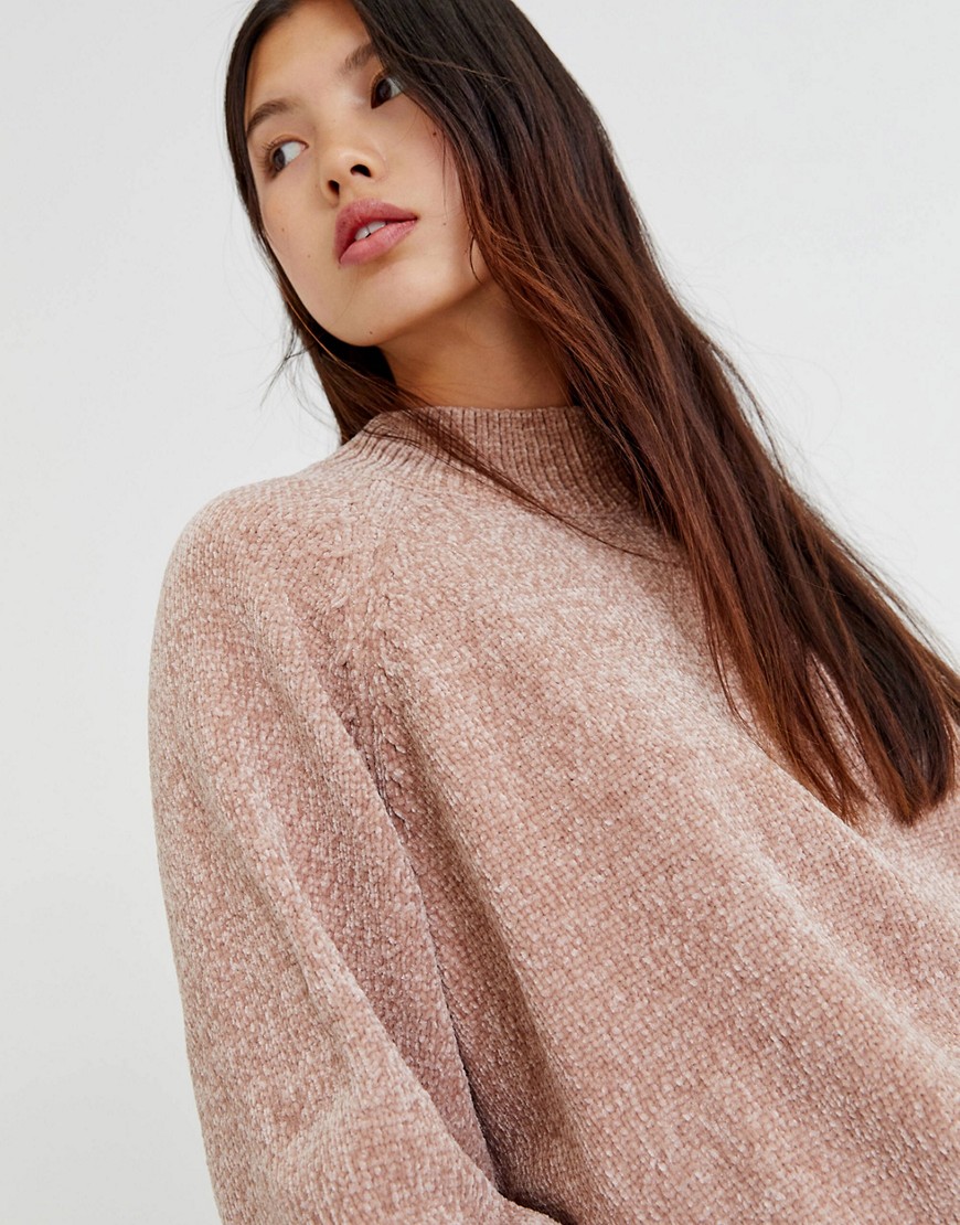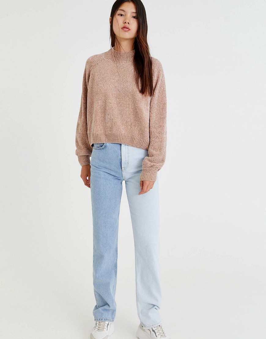 Pull&Bear sweter szenilowy z okrągłym dekoltem brązowy XS