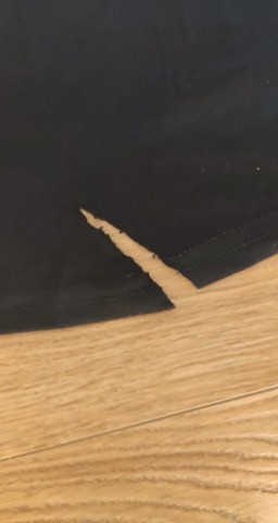 - Defekt: rozdarcie u dołu na trenie