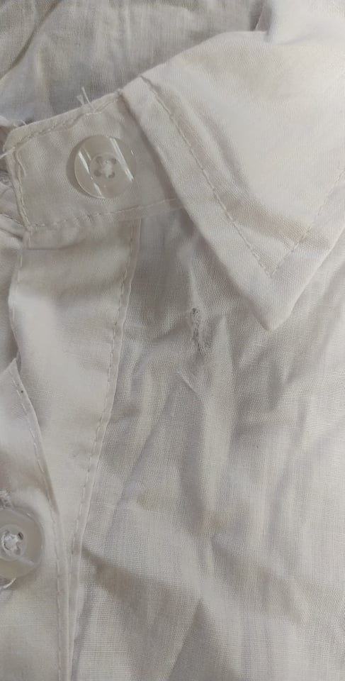 - Defekt : przetarcie materiału, przy kołnierzyku z przodu, zdjęcie w galerii produktu