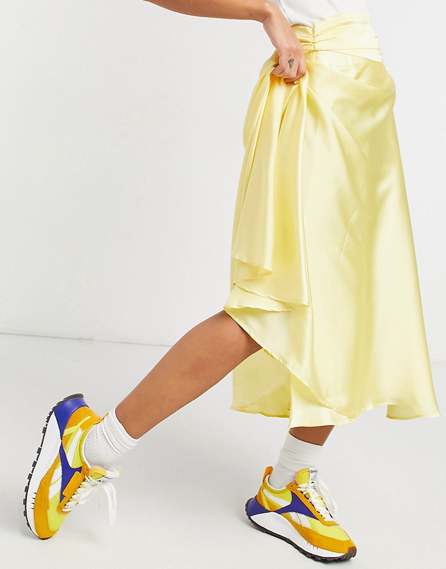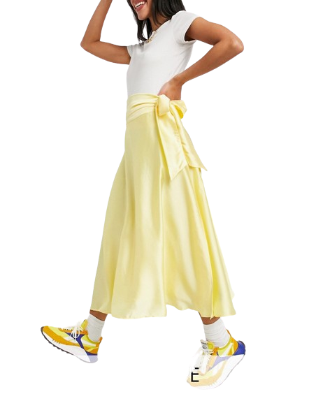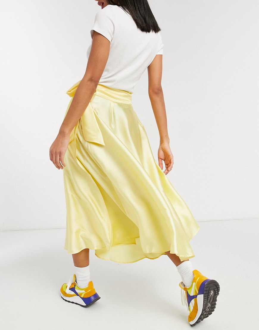 Reclaimed Vintage Inspired żółta satynowa spódnica midi z wiązaniem 38