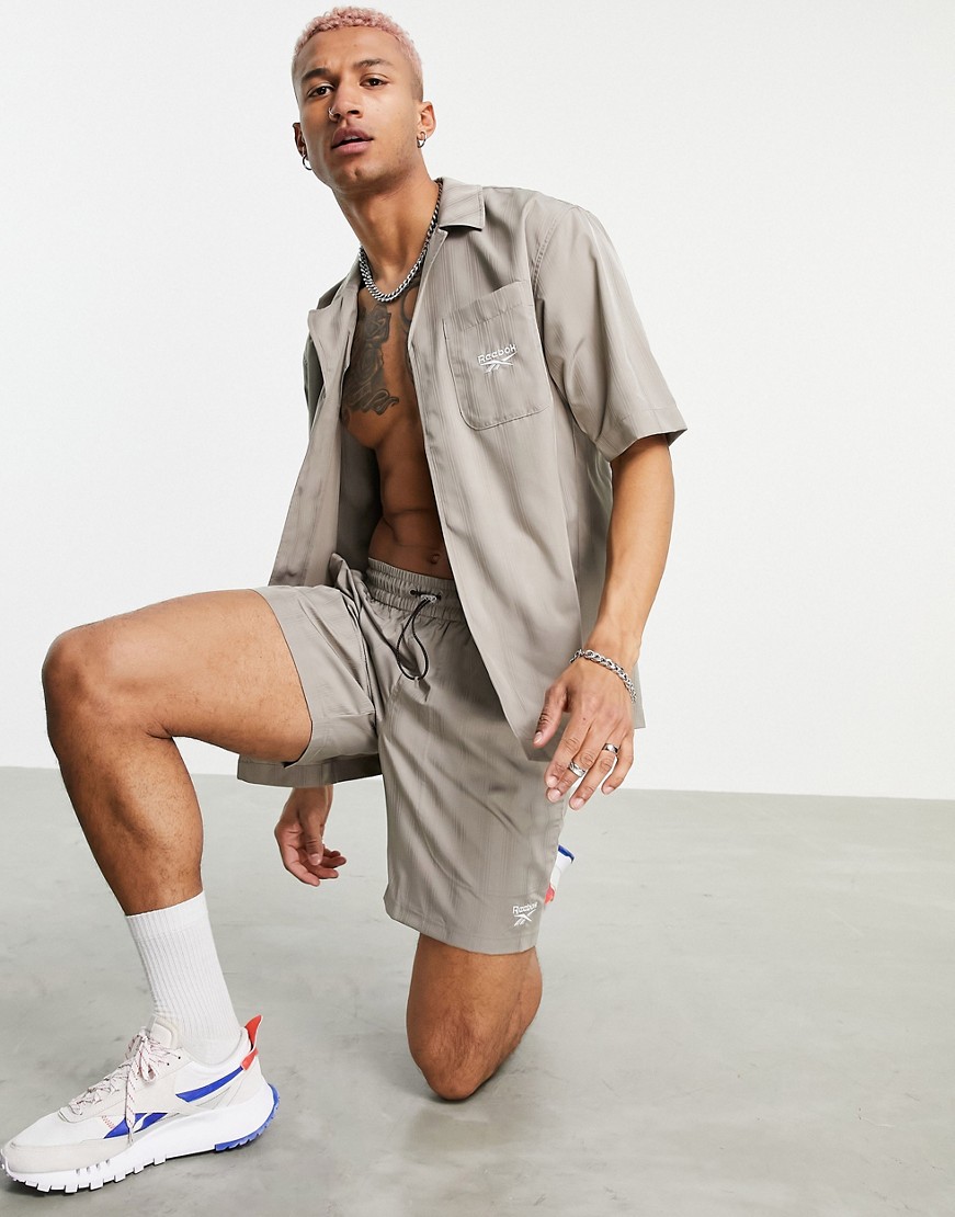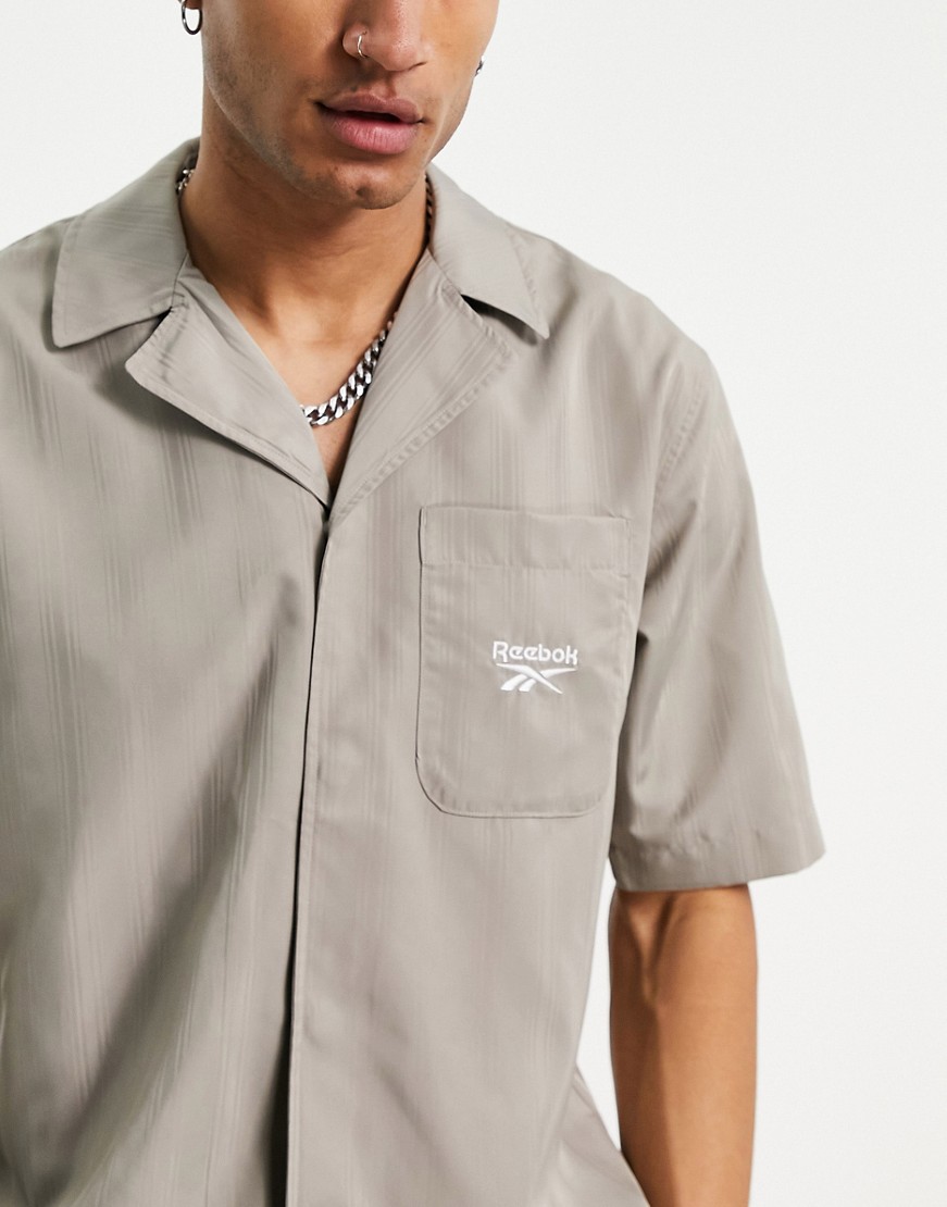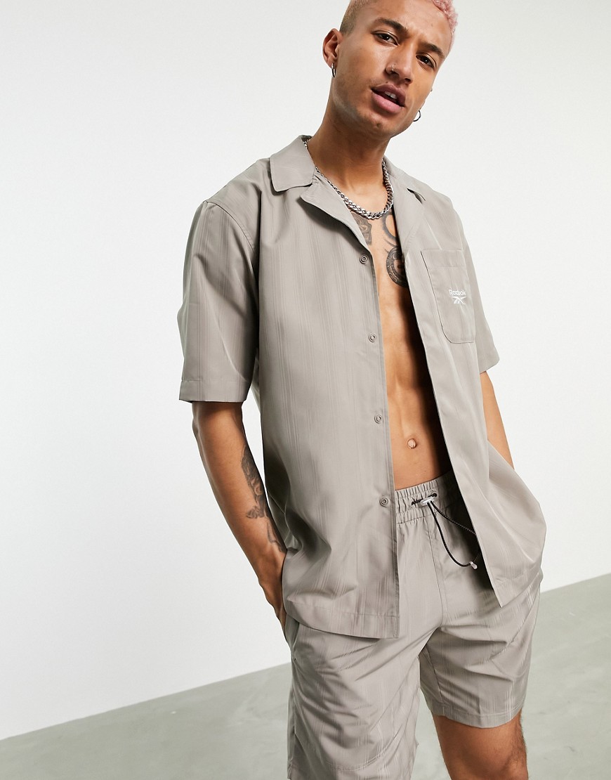 Reebok beżowa męska koszula z kołnierzykiem kubańskim w paski xs