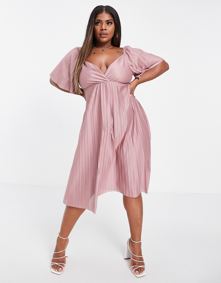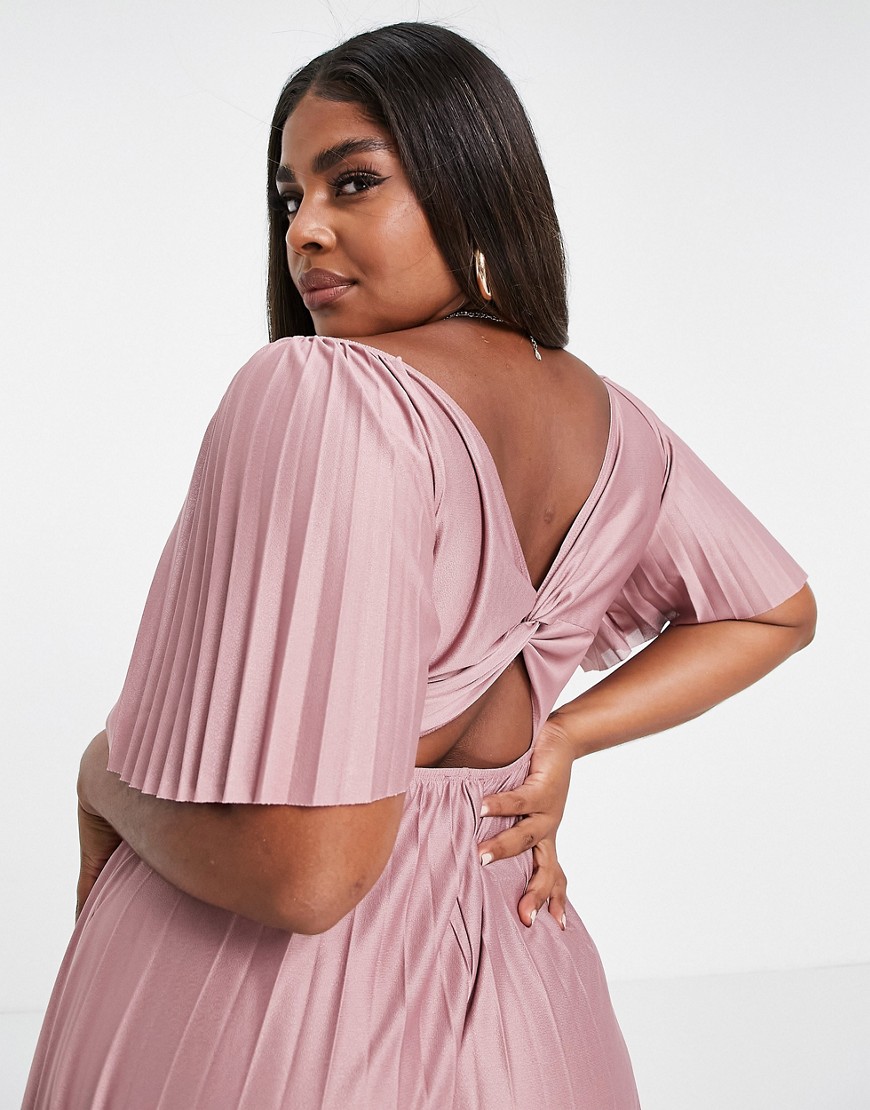 Różowa plisowana sukienka midi ze skręconym tyłem i krótkimi raglanowymi rękawami 44
