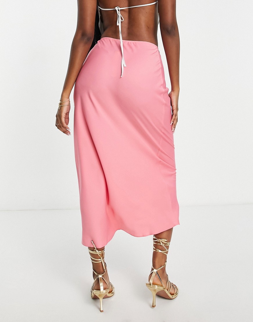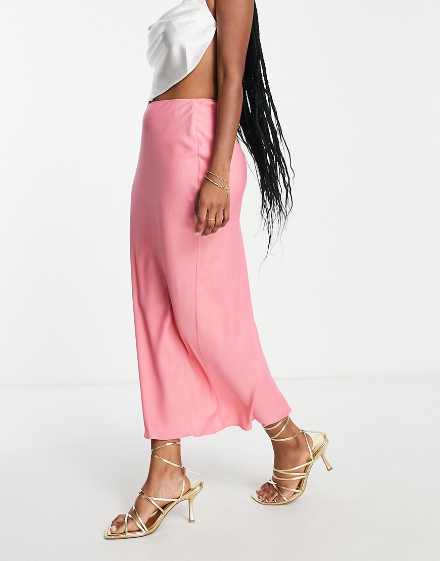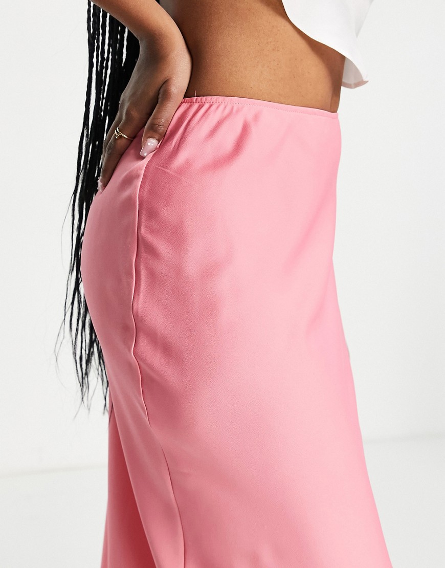Różowa satynowa wciągana spódnica midi szyta ze skosu defekt 38