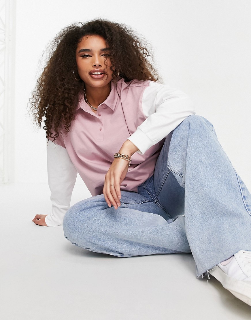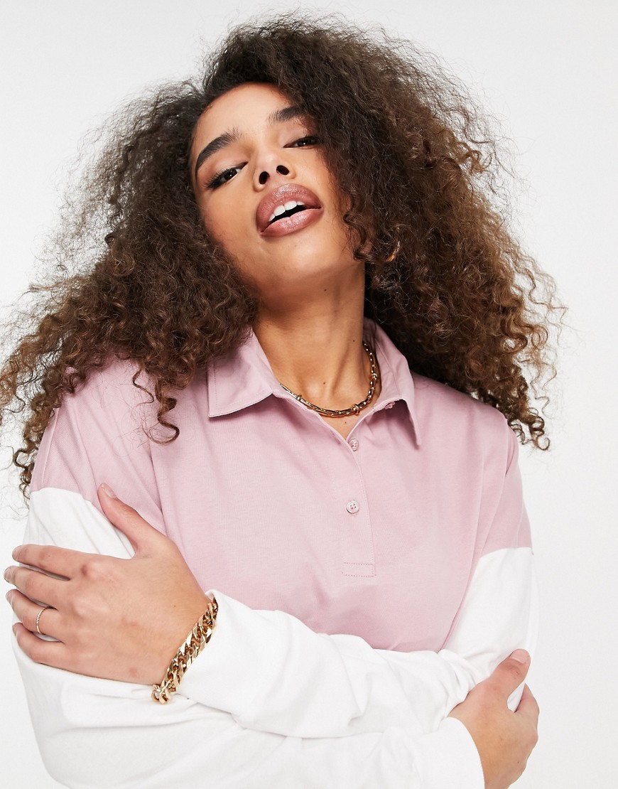Różowo biała koszulka polo z długim rękawem efekt sprania 44